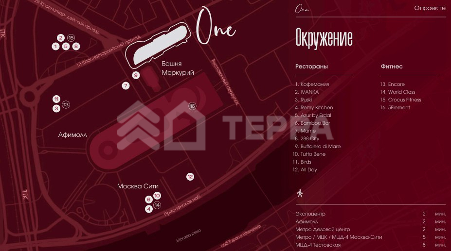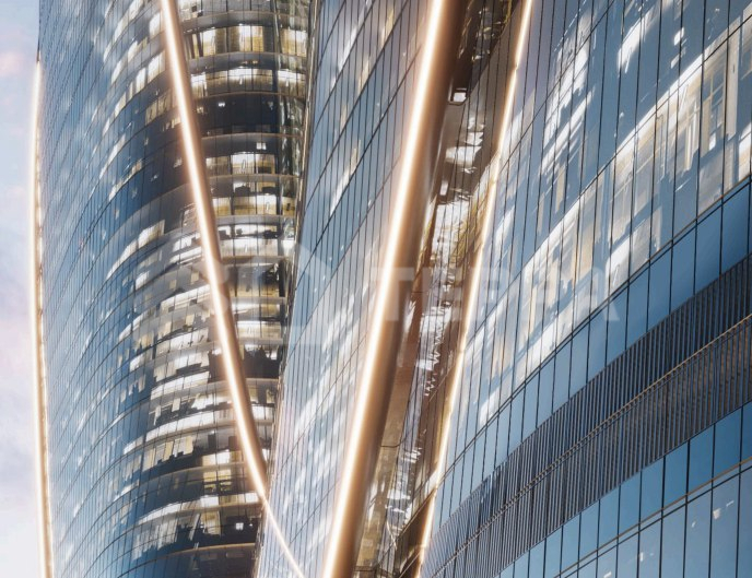 One – самая инновационная башня высотой 379 метров, авторами которой являются главный архитектор Москвы Сергей Кузнецов и международное бюро Genpro. Башня расположена на границе Москва-Сити и нового района «Сити-2», завершая формирование делового центра и открывая новую главу в развитии столицы. Архитектура здания — две башни, соединённые в нижней и верхней точках, — символизирует переход между настоящим и будущим. One сочетает статус, выразительный облик и комфорт премиального уровня. С высоты небоскреба открываются захватывающие виды: сверкающие башни Москва-Сити, центр столицы, Москва-река, Кутузовский проспект, Дом Правительства и легендарные сталинские высотки Уникальная и узнаваемая архитектура, а на 85 этаже находится Sky Garden — самый высокий в Европе оазис природы, секретный сад в облаках.