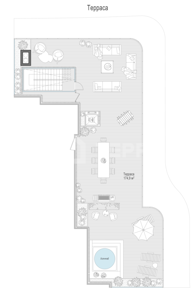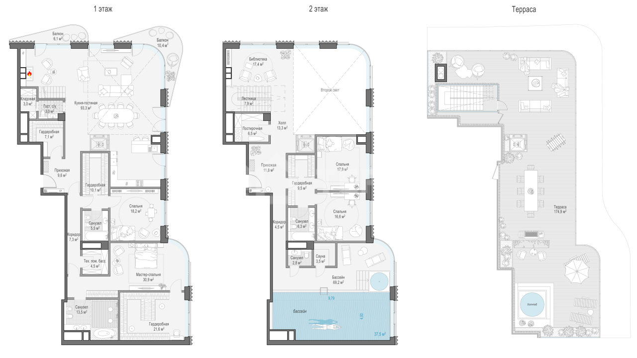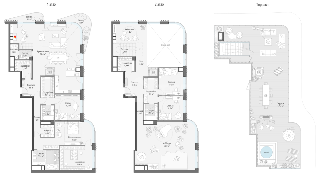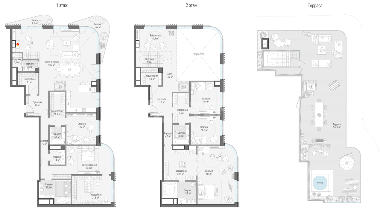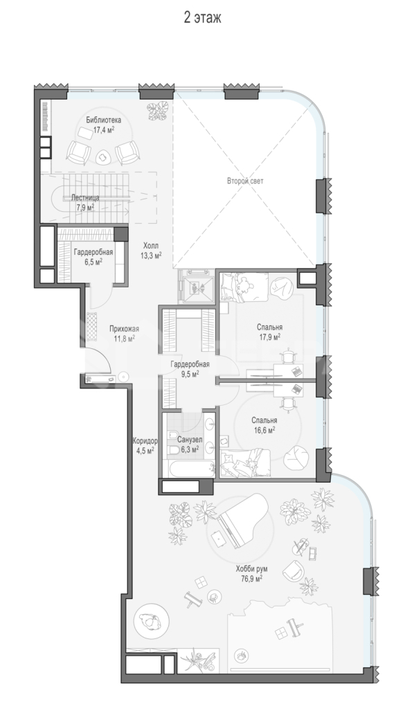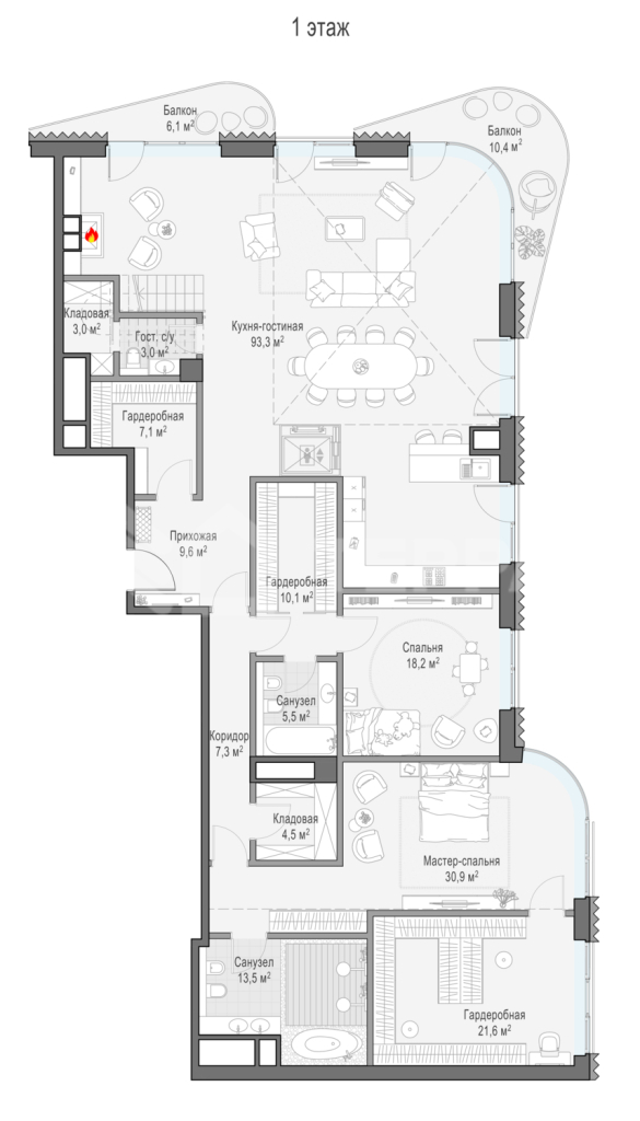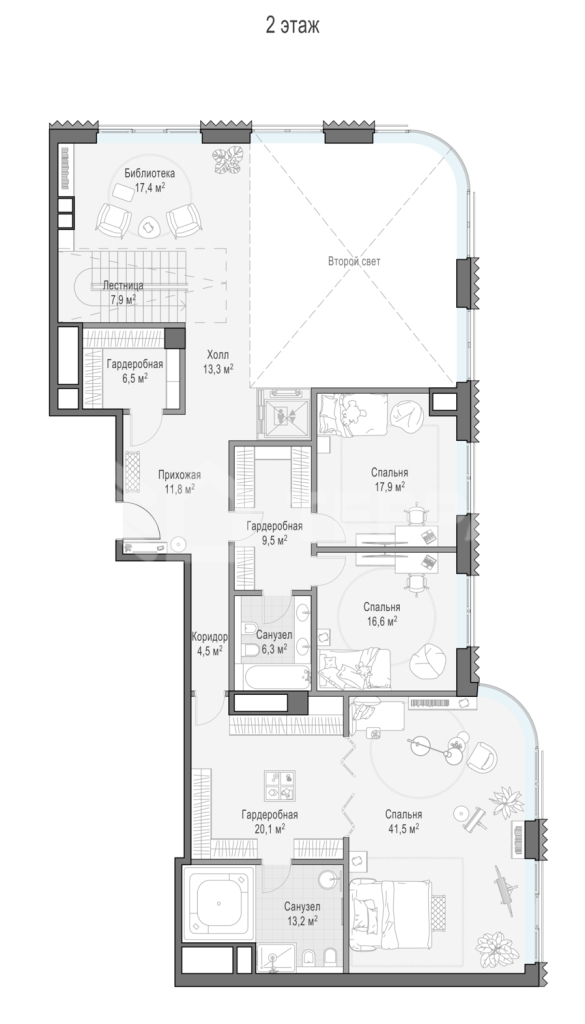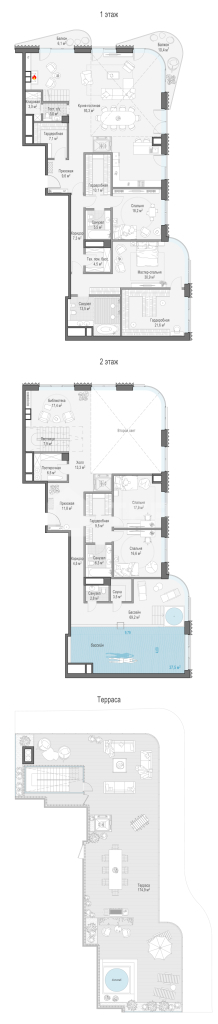 Просторный двухуровневый пентхаус площадью 417 кв. м. Кухня-гостиная (98 кв. м) имеет второй свет (высота потолка 7,9 метра); оокна выходят на Кремль и Лаврушинский переулок, панорамное остекление, моллированное окно и открытые балконы улучшают видовые характеристики пентхауса. Есть возможность установить дровяной камин и обустроить на крыше открытую террасу площадью 180кв. м. Продуманная планировка позволяет разместить пять спальных комнат с отдельными санузлами и гардеробными и кабинет.
