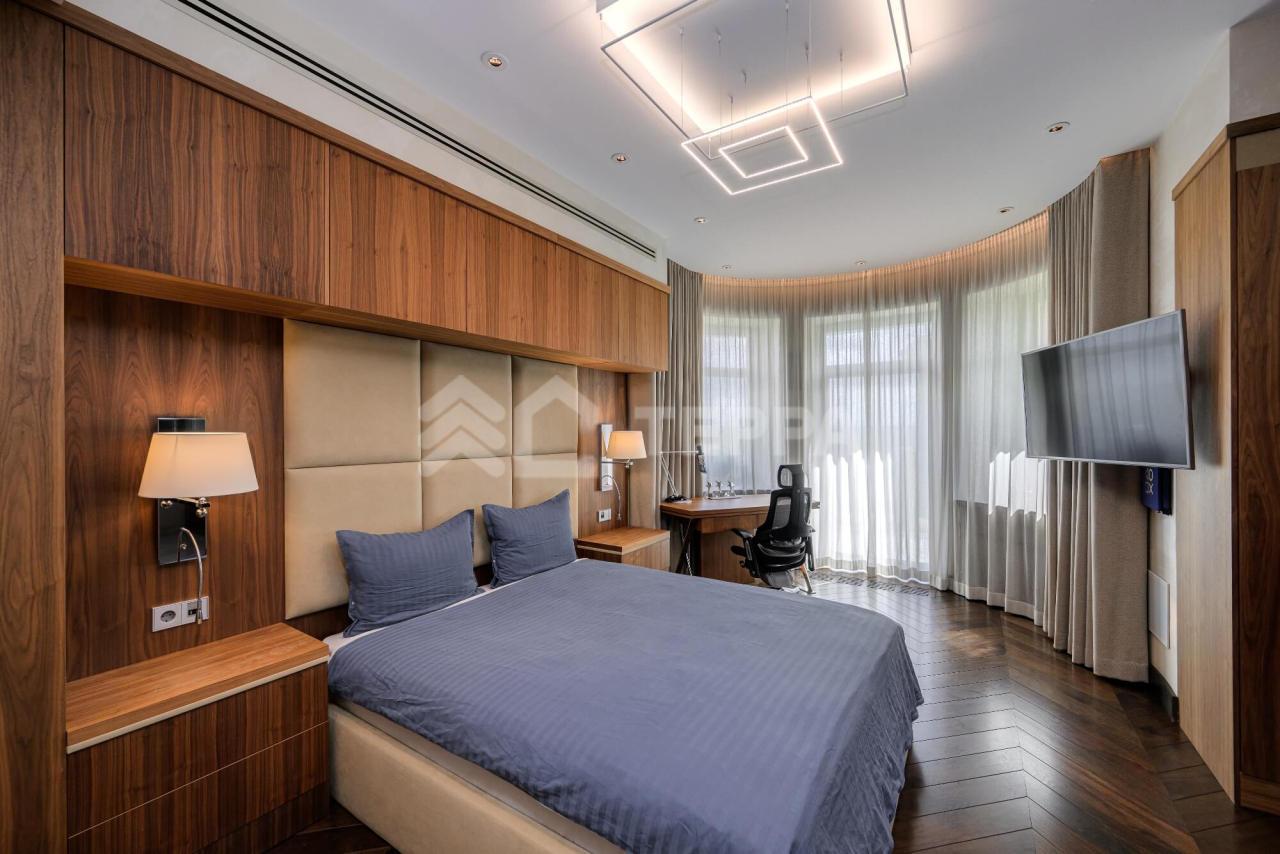 Основной дом 560 кв.м: 4 спальни, кухня, столовая-гостиная, гостиная с камином и “вторым светом”, кабинет, спортивный зал, гараж на 2 м/м со стеклянными воротами. Гостевой дом 126 кв.м: 3 спальни, 2 с/у, кухня - гостиная, гараж на 1 м/м.