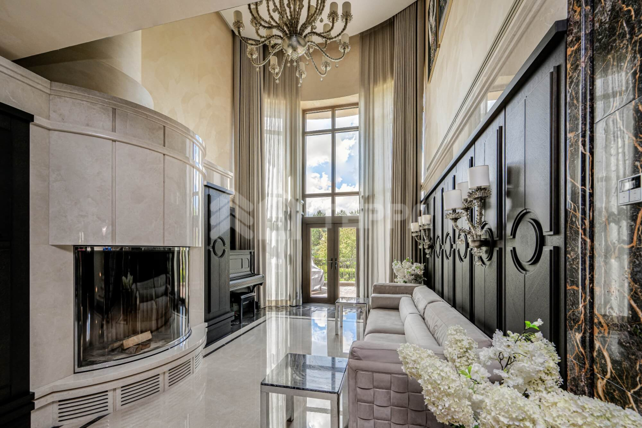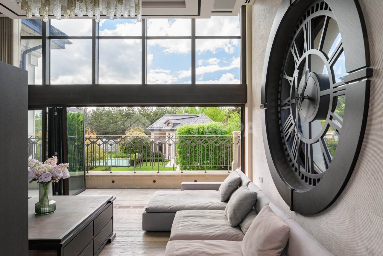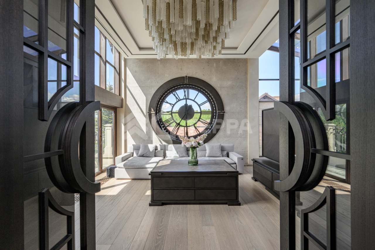 ОСОБЕННОСТИ ДОМА: Винотека на 1200 бутылок. Рабочие фасадные часы в гостиной в стиле Breguet (диаметром 2 метра, изготовлены по спецзаказу во Франции). Самая большая в мире каминная топка заводского производства (с открывающейся хромированно- стеклянной створкой, управляемой с пульта, производство -Spartherm, Германия.