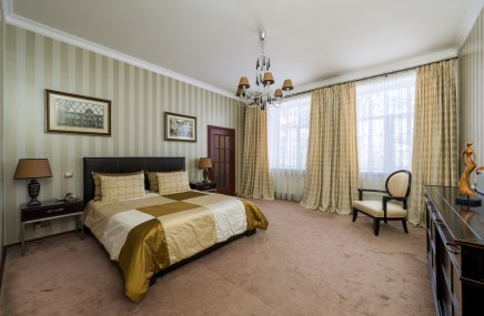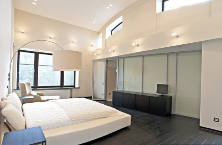 Хозяйская спальня на втором этаже отделена от гостиной звукоизолирующей стеклянной стеной. Это пространственное решение визуально увеличило объём комнаты. Наполнение спальни: кровать, панели - ANTON PETROV Unique Home. Кресла, покрывало - MHC (Milano Home Concept). Текстильное оформление кровати - Ateliertati. В мастер-ванной — мрамор Giallo Siena, смесители, Fantini, раковины, Artceram, сложная конструкция зеркал с покрытием нитридом титана, уникальные металлические ручки.