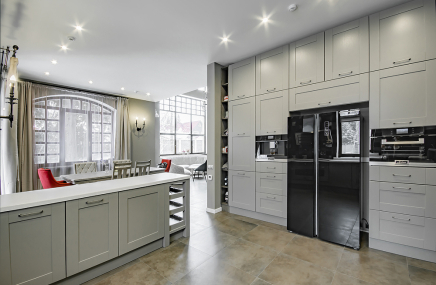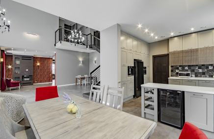 1-й этаж отведен под объединенное пространство двусветной гостиной и столовой с выходом на участок и к беседке-барбекю. А кухню от гостиной отделяет раздвижная перегородка из тонированного стекла. Также на 1-м этаже есть большой спальный блок – гостинаядетская игровая, спальня с су и гардеробной. Также здесь расположены сезонная гардеробная, гостевой су и гараж на 2 мм, отделанный также качественно, как и весь дом.