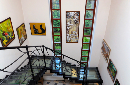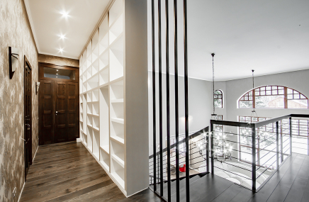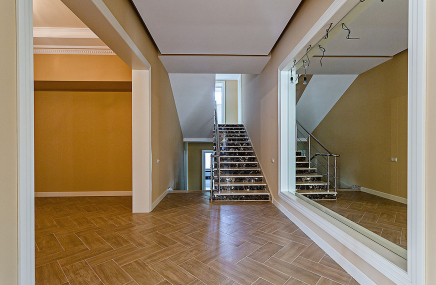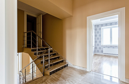 Лестница выглядит эффектной за счёт отделки чёрным дубом и использования подсветки ступеней. Она выполнена в виде абстрактного орнамента, напоминающего стилизованные ветки дерева. Стена здесь оформлена декоративной штукатуркой, повторяющей структуру натурального камня с золотыми прожилками.