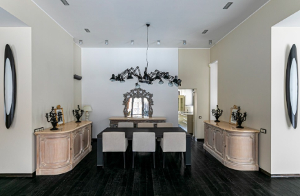 В отделке кухонной мебели использованы чёрная эмаль с глянцевым лаком, вставки из жидкой латуни, декоративное покрытие фасадов «лава», гранит Brown Antique. Кухня, ANTON PETROV Unique Home. Обеденный стол выполнен на заказ. Стулья, Deep House. Подсвечники, Repeat Story.