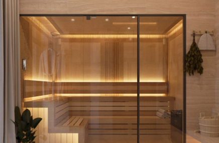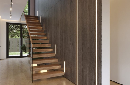Лестница монолитная, отделка дубом с умной подсветкой ступеней, ограждение из закаленного стекла. Двери невидимки, армированные.