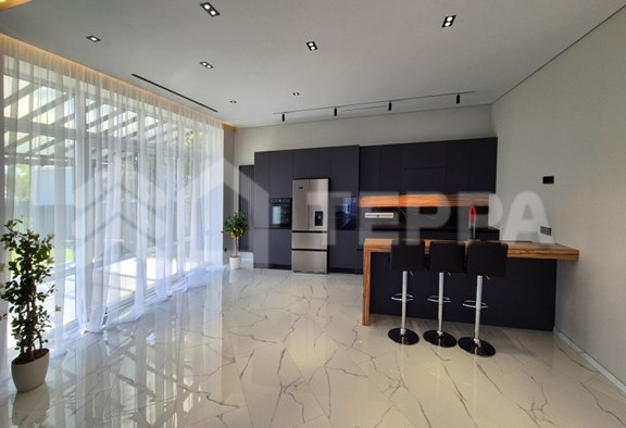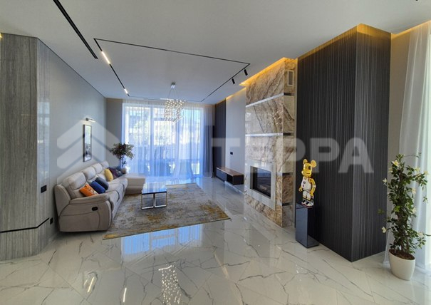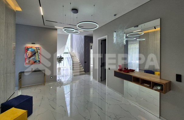 На 1 этаже расположены: Гараж теплый с дренажной системой на 2 а/м 39 кв. м.; Просторный и светлый Холл 23,5 кв. в холле встроенный слэб из натурального мрамора (обработка Италия); Гардеробная 7,7 кв. м.; Кухня-Столовая 31,5 кв. м. На кухне установлена новая мебель с функциональным островом (2,5 пог.м.) от студии "Giulia Novars" с бытовой техникой премиального французского пр. DeDietrich. Современные фасады (каталог 2025г.), каменная столешница; барная стойка отделана натуральным шпоном «Палисандр», декоративная подсветка, кладовая 6,6 кв.м. Гостиная 35 кв. м., с дровяным камином EdilKamin (отделка камина – натуральный оникс мес. рождения Италия), Раздвижные окна для выхода на уютную летнюю террасу 30 кв.м. и участок; гостевой с/у 5,5 кв. м.; Бойлерная 9 кв. м.; СПА –зона комната для отдыха 21 кв.м. с выходом на участок + душевая, сауна 6,3 кв.м. с автоматическим управлением, панно из гималайской соли.
