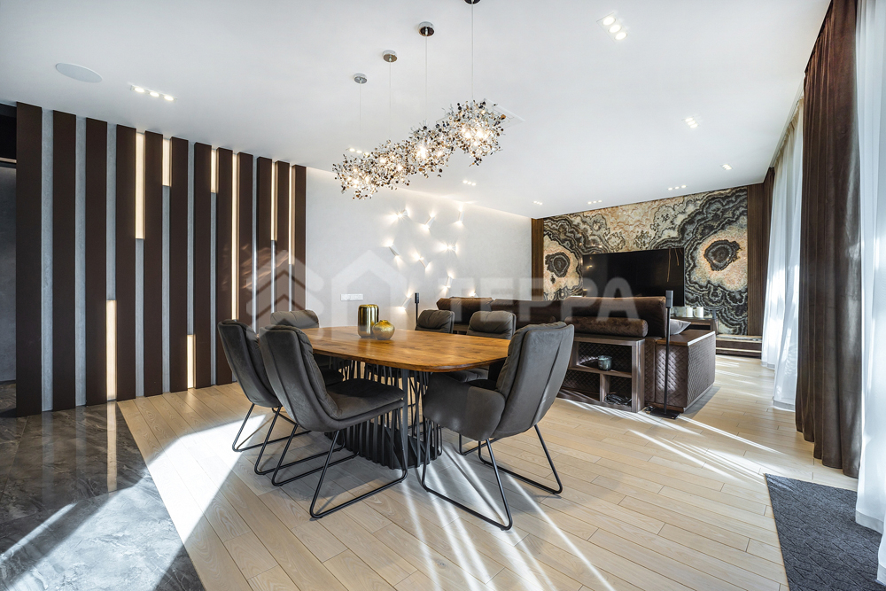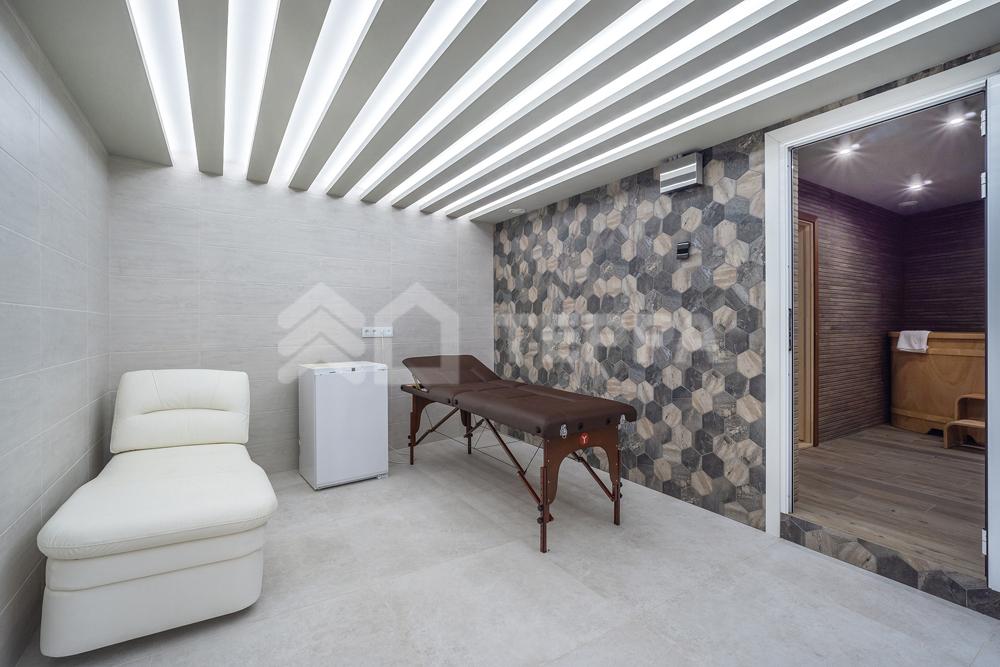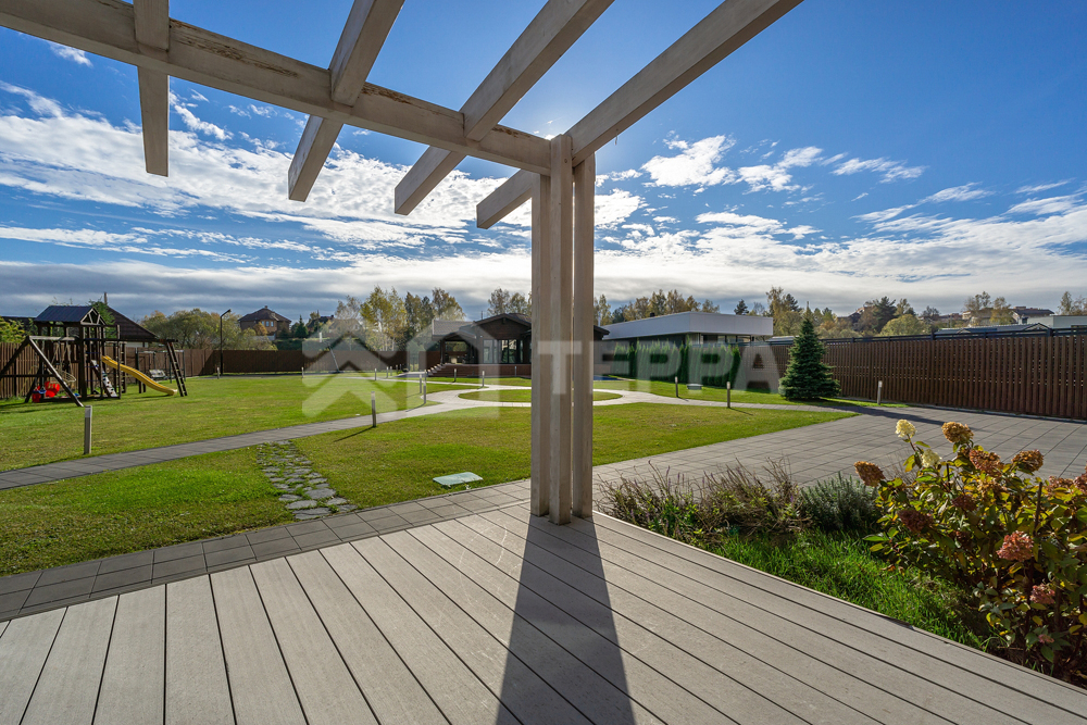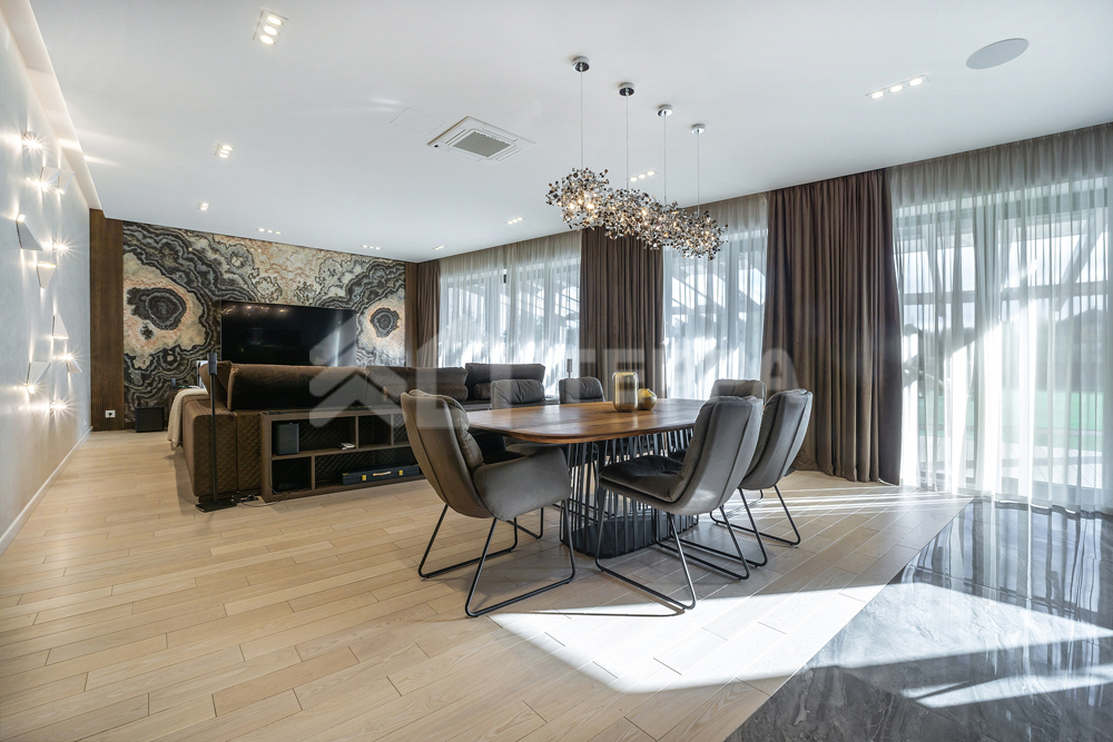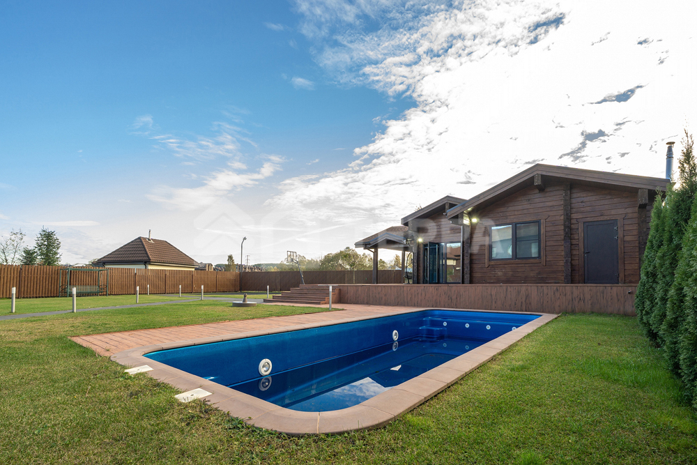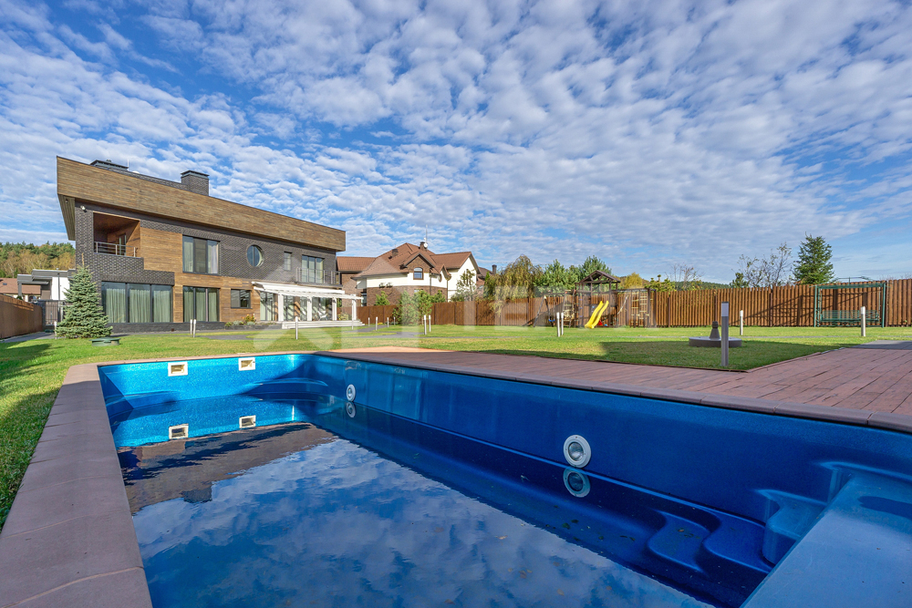 бассейн, детская и спортивная площадки, инвентарное помещение. Светлый просторный дом выполнен из высококачественных материалов, в отделке использованы натуральные материалы, много дерева, камень - стена в гостиной полностью выполнена из оникса с подсветкой.