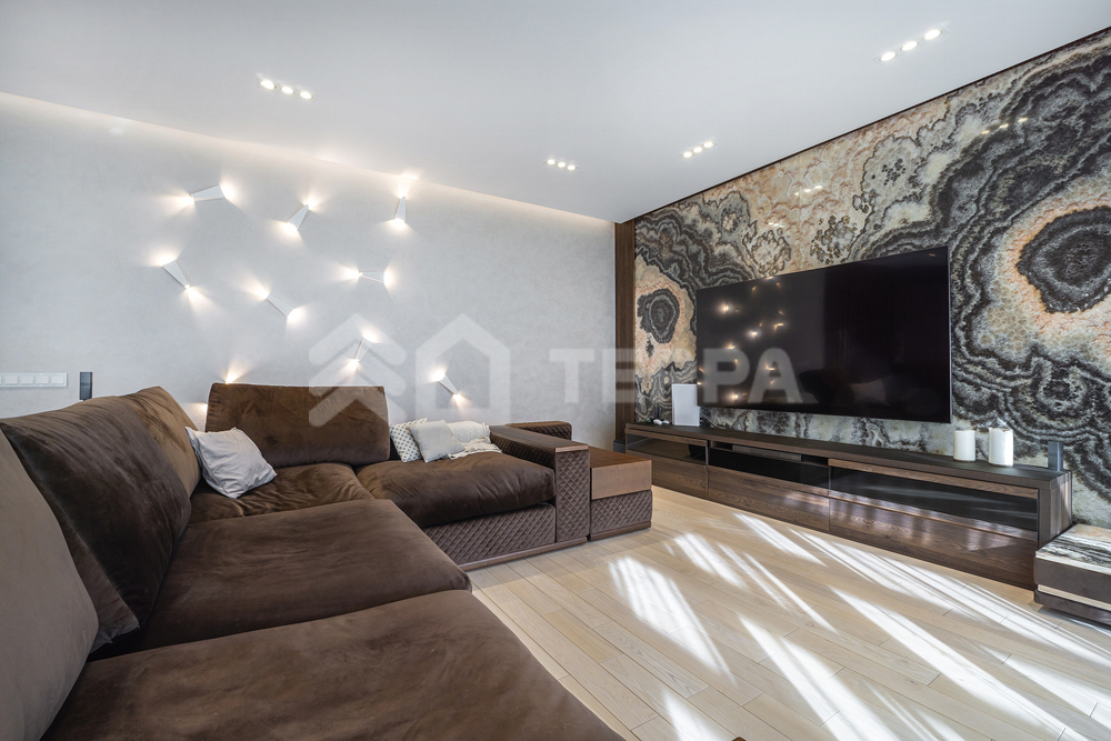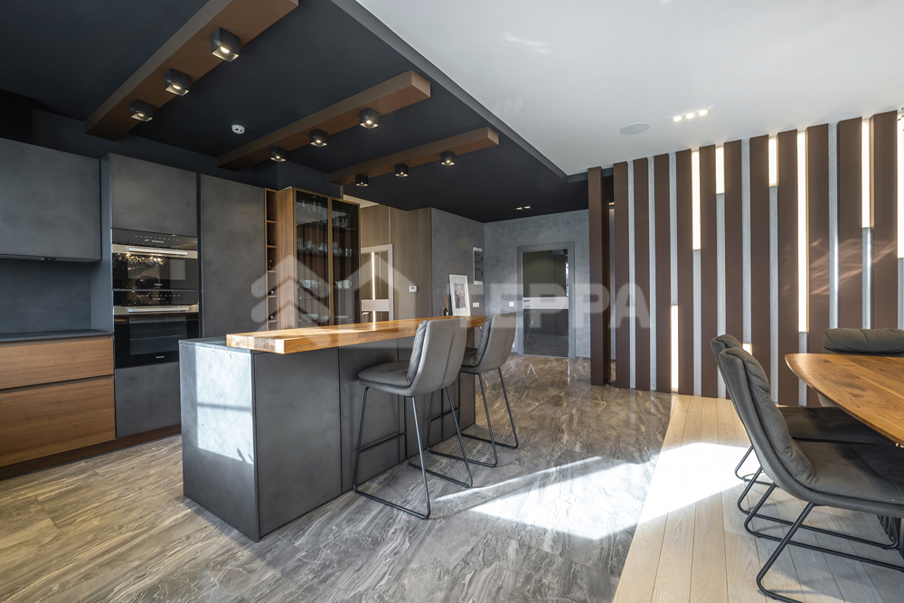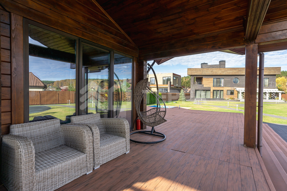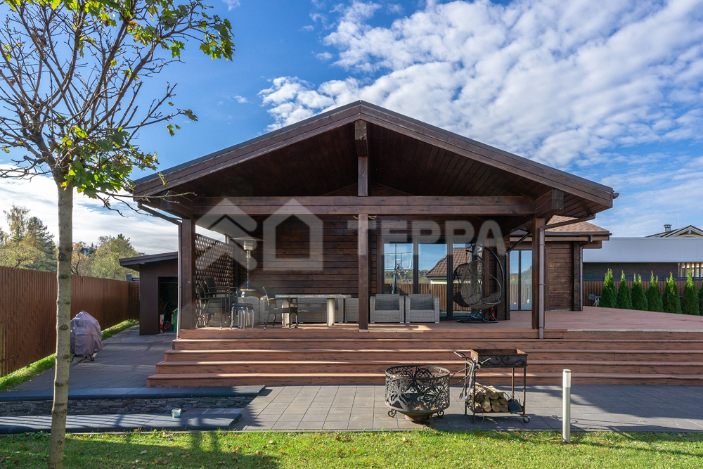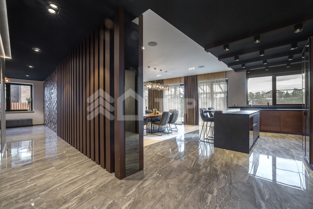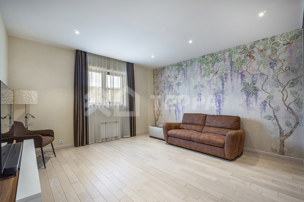 бассейн, детская и спортивная площадки, инвентарное помещение. Светлый просторный дом выполнен из высококачественных материалов, в отделке использованы натуральные материалы, много дерева, камень - стена в гостиной полностью выполнена из оникса с подсветкой.