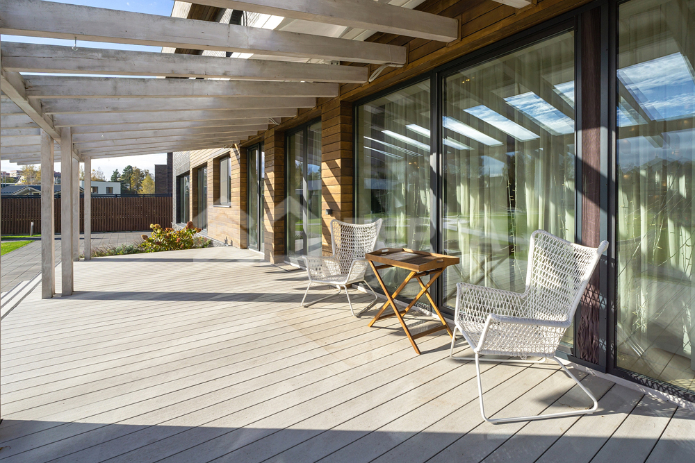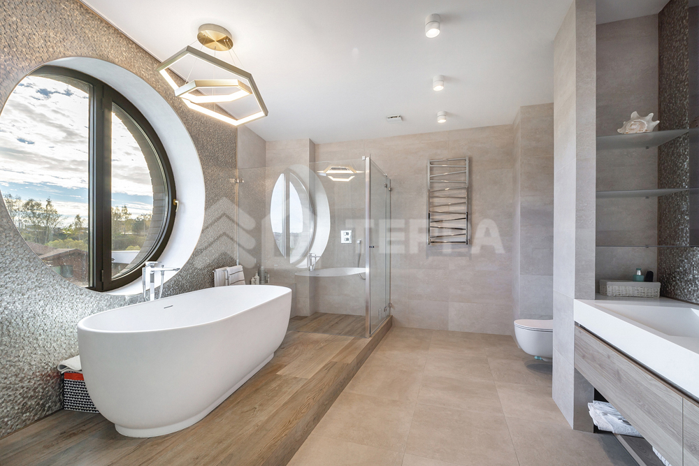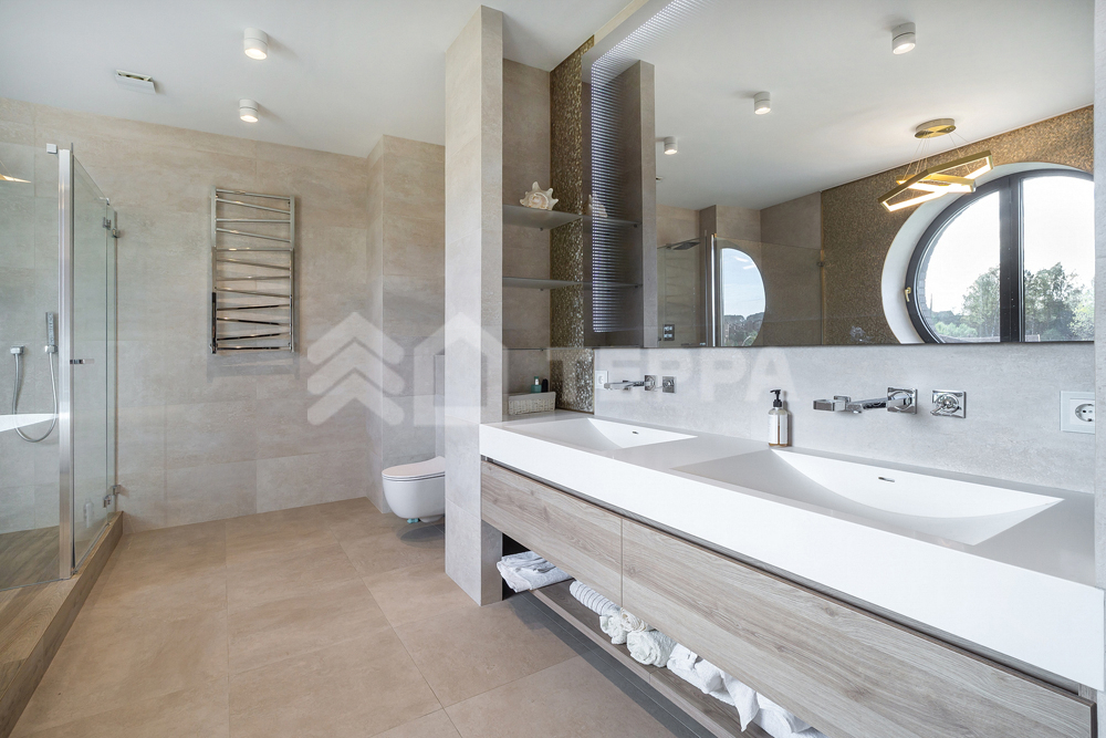 Заполнение оконных проемов алюминиевыми конструкциями с энергосберегающими стеклопакетами, в доме выполнена центральная вентиляция приточная и вытяжная, кондиционирование. Центральное водоснабжение с системой водоподготовки и поливом зеленых зон.