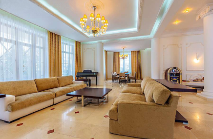 В доме выполнена отделка "под ключ". Отапливаемый пол из натурального художественного паркета и мрамора. Лестница с коваными перилами, лепнина, потолки с ручной росписью.