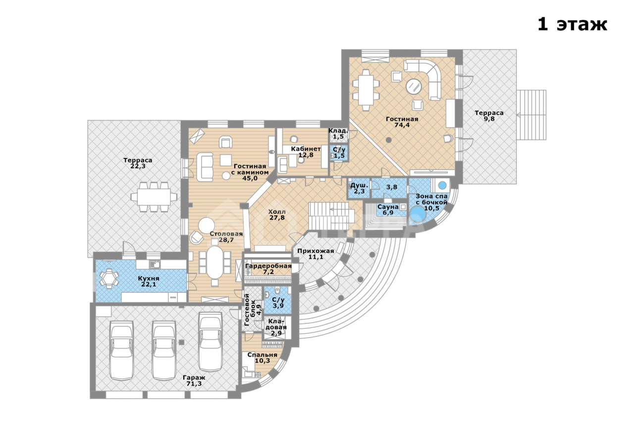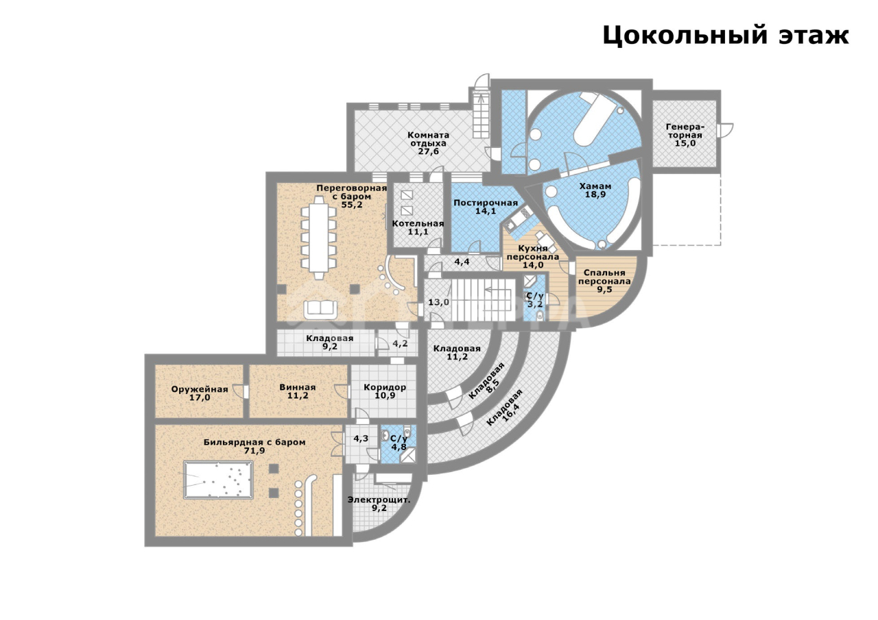 В доме: 7 спален, гостиная, каминный зал со столовой, изолированная кухня, спа-комплекс с сауной и хаммамом, бильярдная, 2 бара, винная, библиотека, несколько помещений свободного назначения, блок персонала с отдельным входом, гараж на 3 м/м, многочисленные террасы и балконы, даже собственная смотровая.