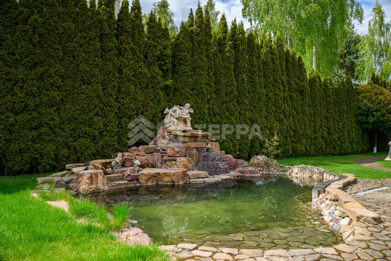 Резиденция стоит на участке с ровным рельефом и живописным ландшафтным дизайном в парковом стиле. На территории установлена беседка с мангалом, фонтан у въезда, сад камней с водопадом и фигурами ангелов, обустроены зоны современных грядок. По периметру территория огорожена хвойными растениями, на участке высажены взрослые растения (канадский дуб, клены, кусты) и плодовые деревья. На участке древесно-подзолистый грунт, выполнен дренаж, есть автоматический полив, устроено освещение. Участок угловой с двумя соседями, расположен недалеко от лесного массива.
