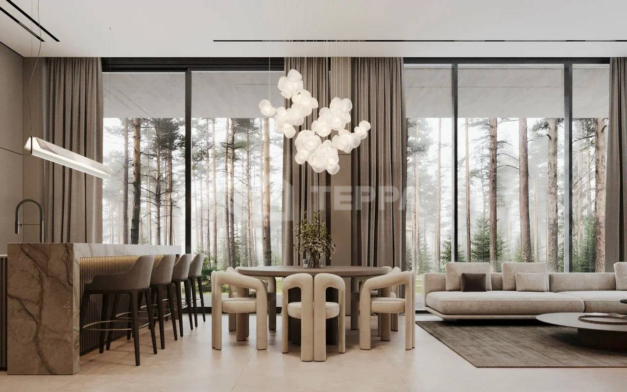 Предлагаем вашему вниманию уникальный двухэтажный дом площадью 395 м? в живописном загородном поселке на участке 12,5 соток. Этот современный дом выполнен в единой архитектурной концепции и готов к проживанию "под ключ" с изысканной мебелью и встроенной техникой от премиальных брендов, таких как Asko и Miele.