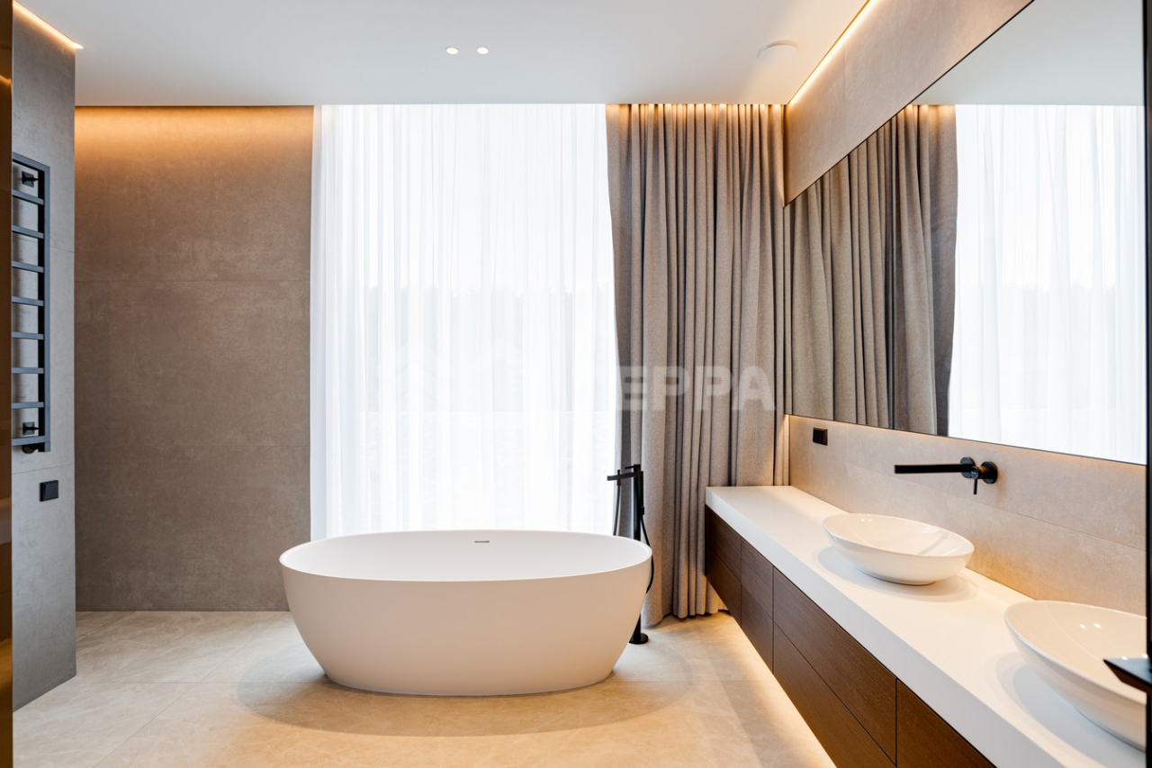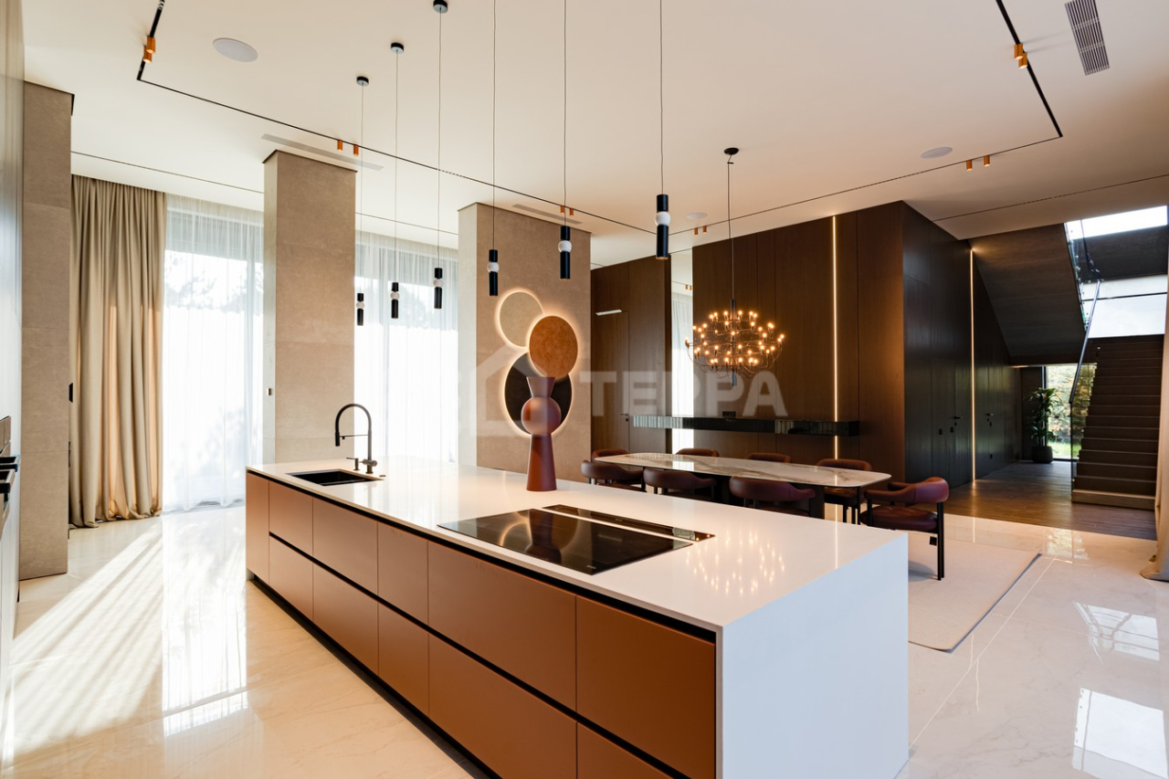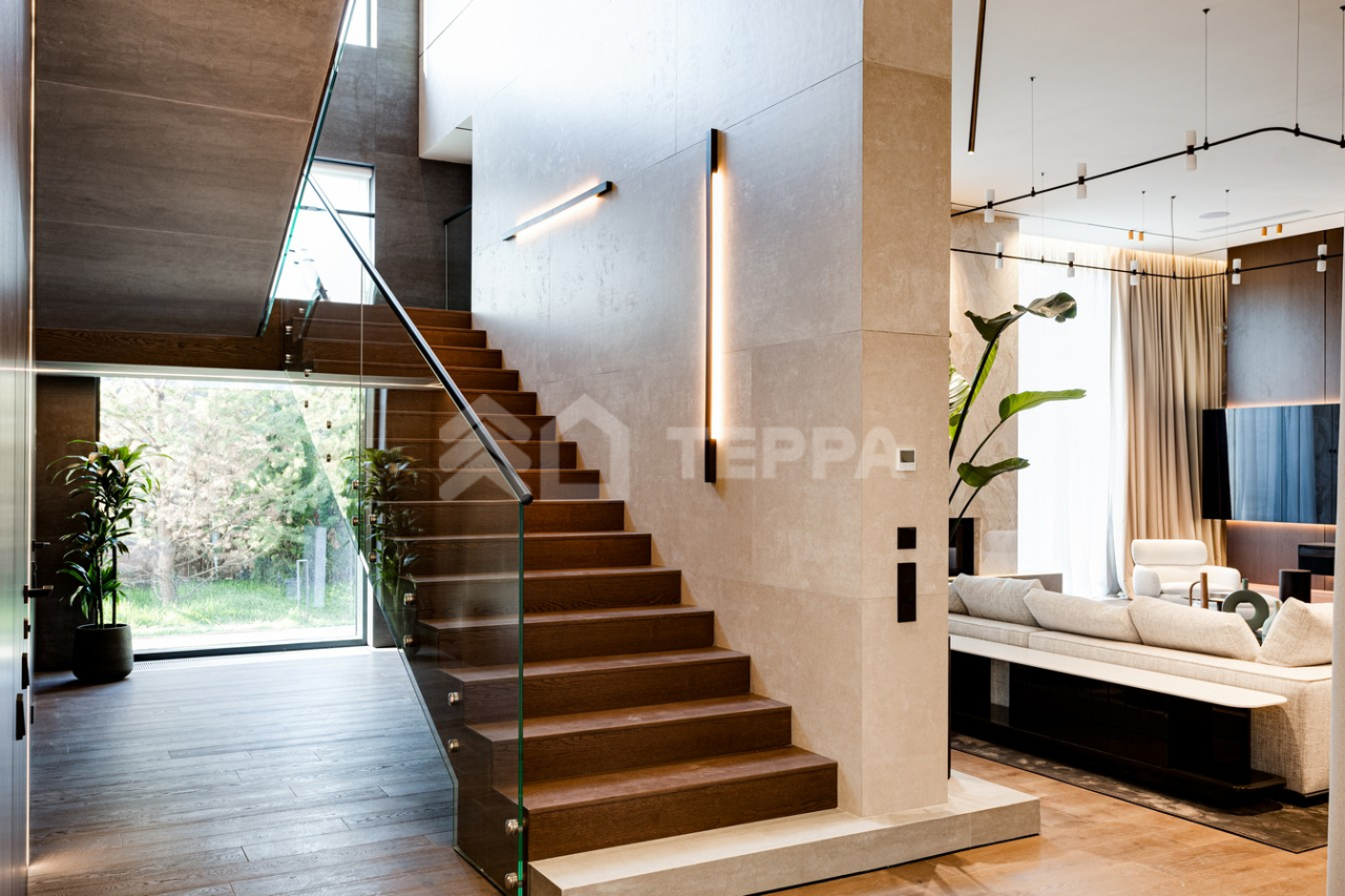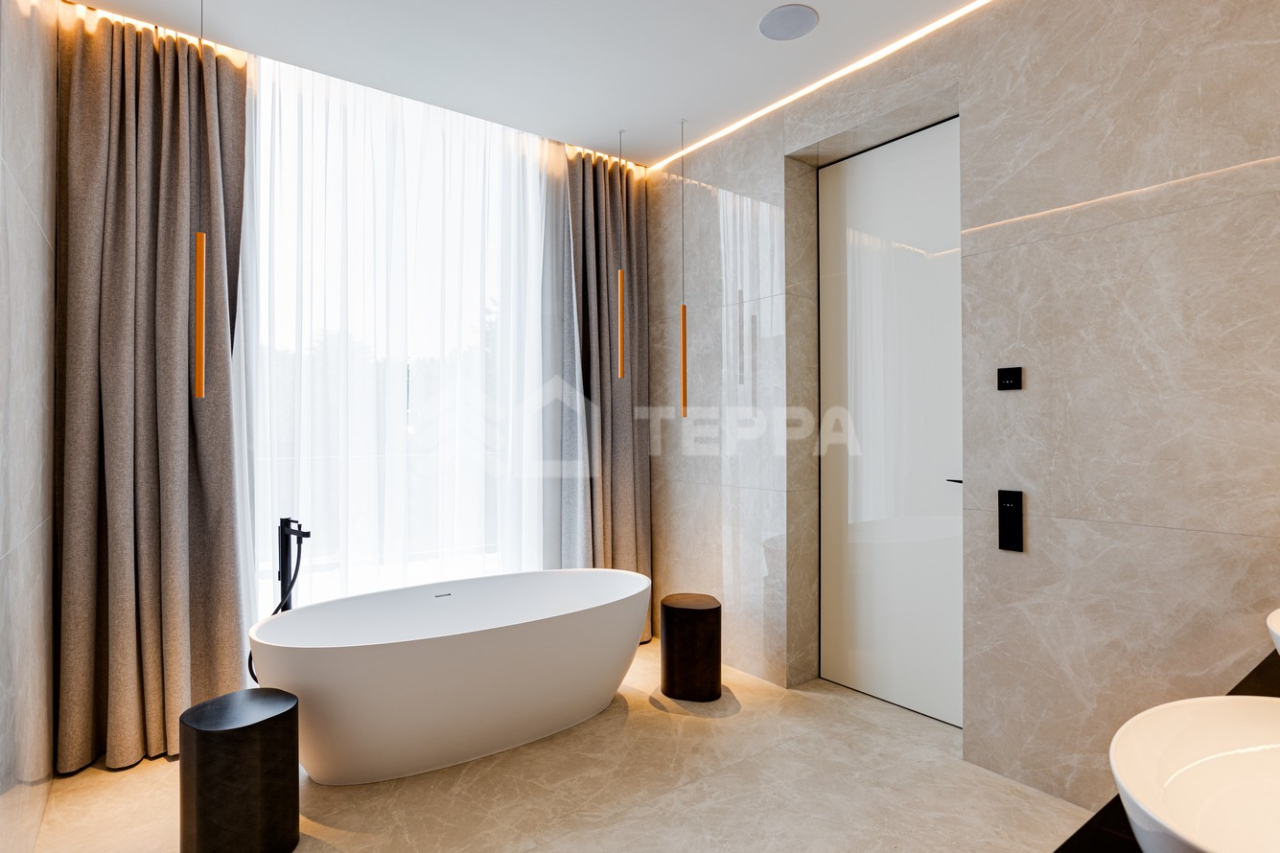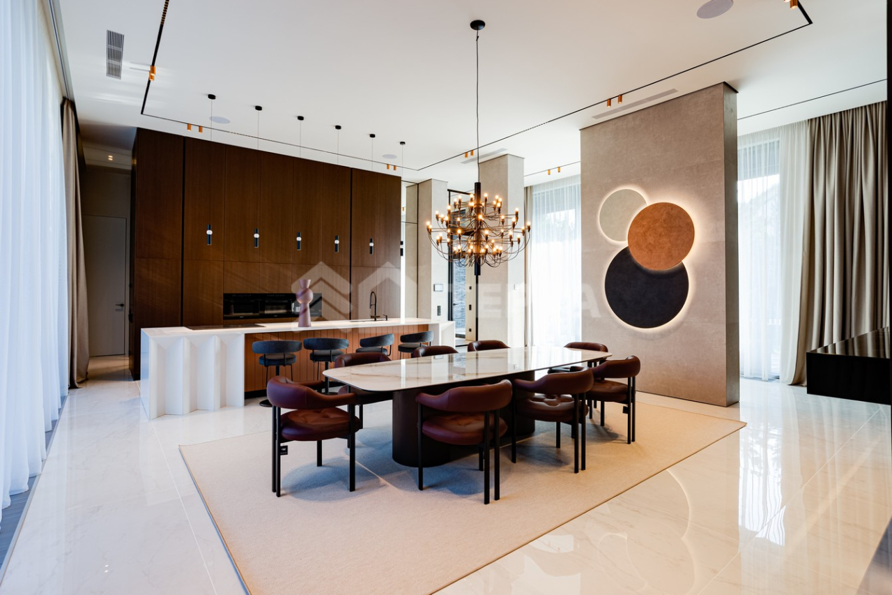 Четкое функциональное зонирование разделяет дом на приватные, общественные, СПА зоны и служебный блок. Высококачественные отделочные материалы, такие как керамика LAMINAM и натуральный камень, подчеркивают стиль и изящество.