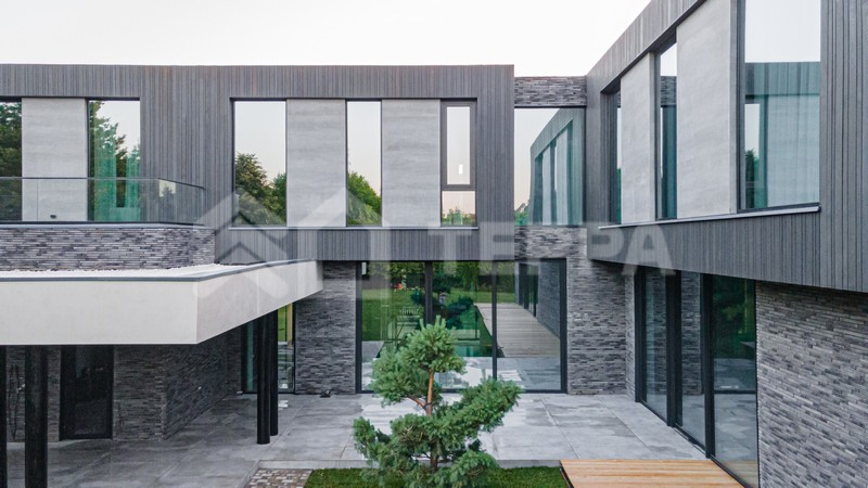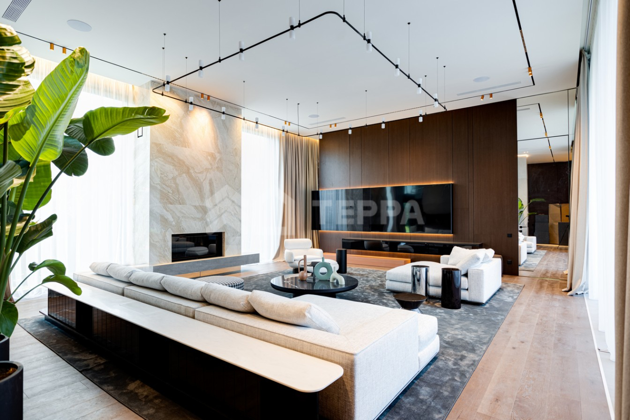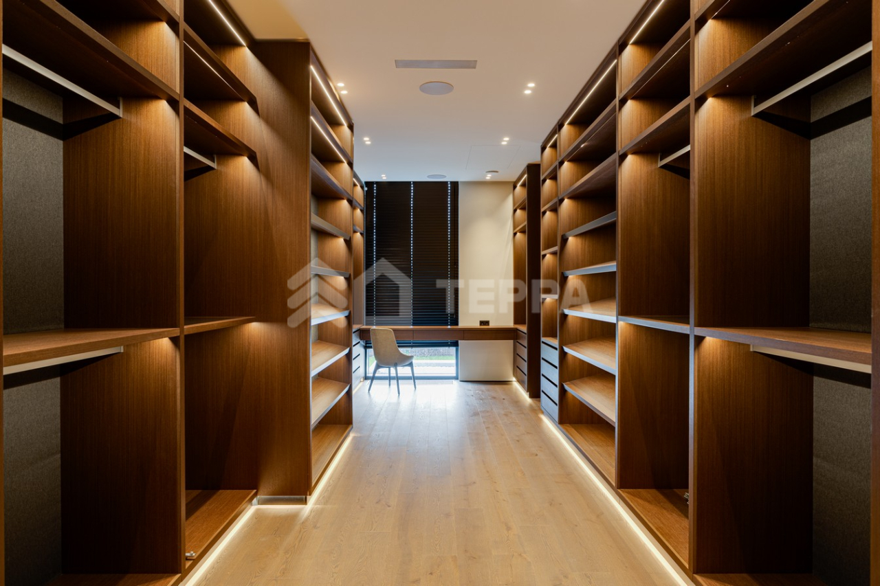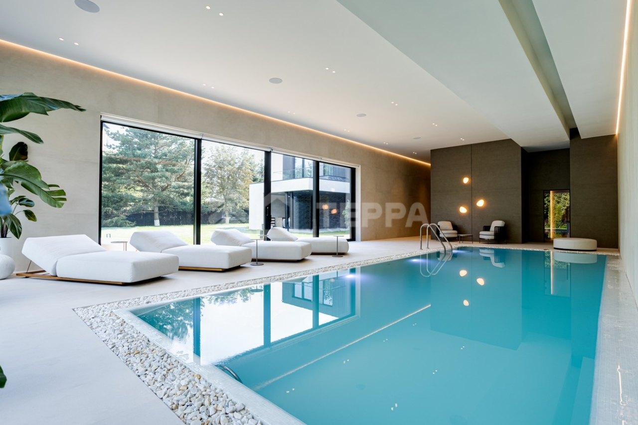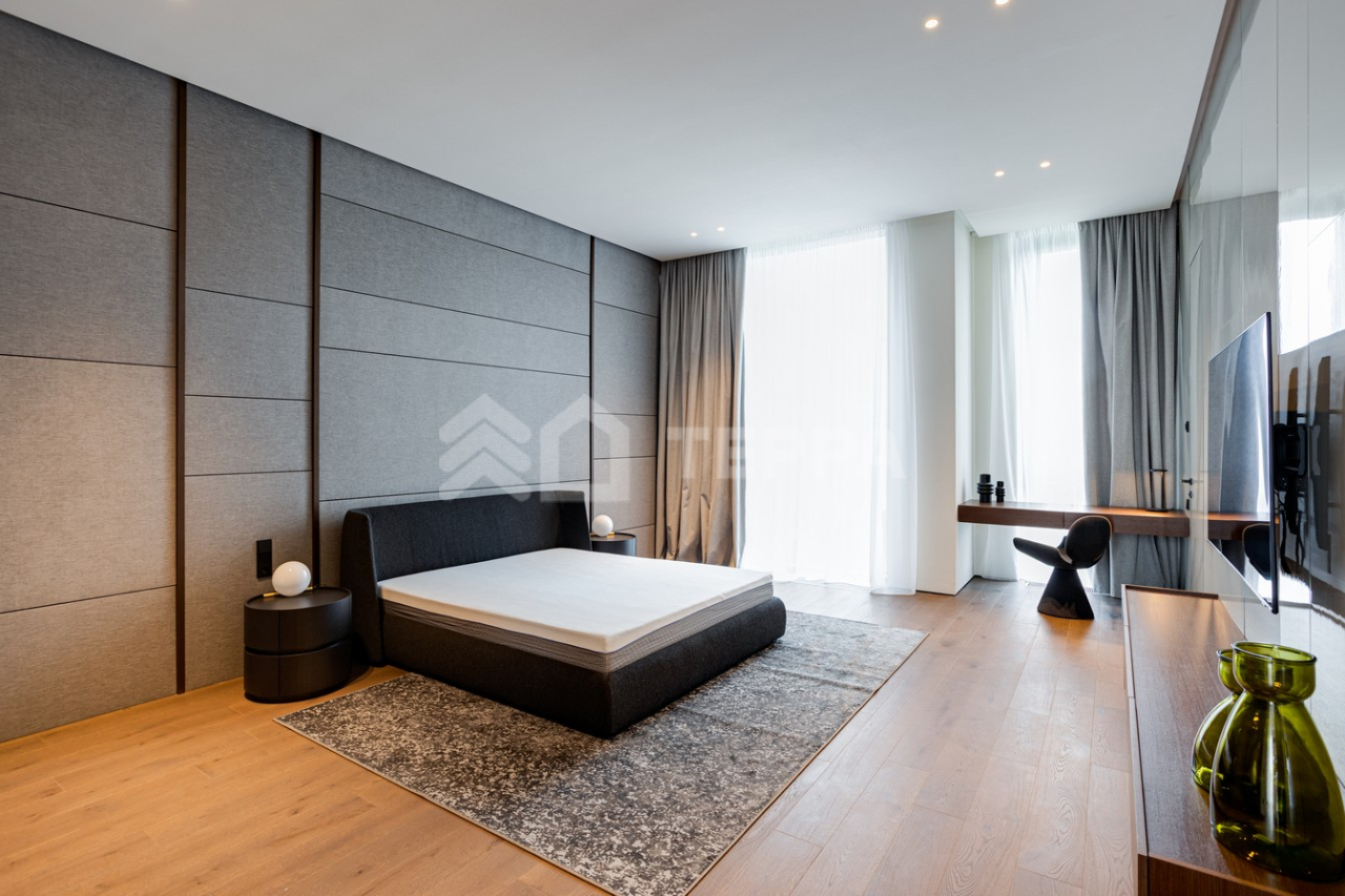 Четкое функциональное зонирование разделяет дом на приватные, общественные, СПА зоны и служебный блок. Высококачественные отделочные материалы, такие как керамика LAMINAM и натуральный камень, подчеркивают стиль и изящество.