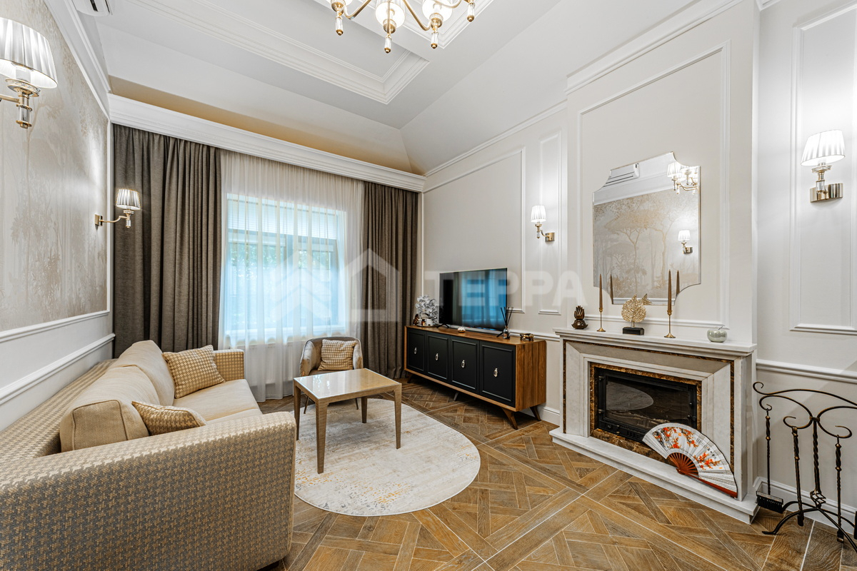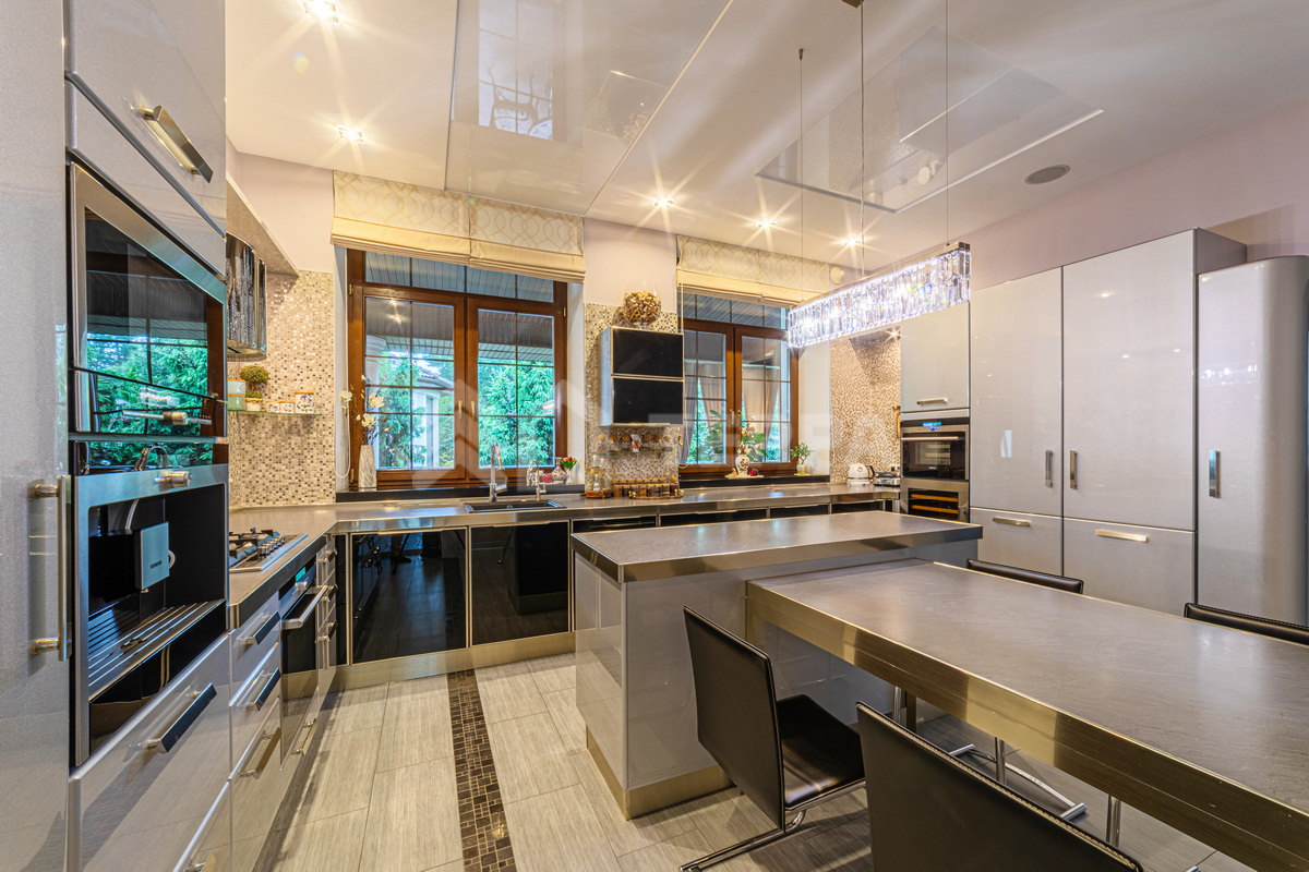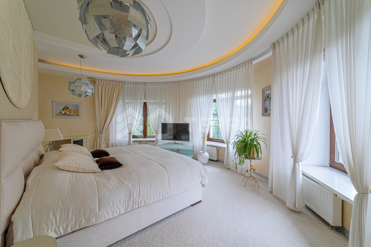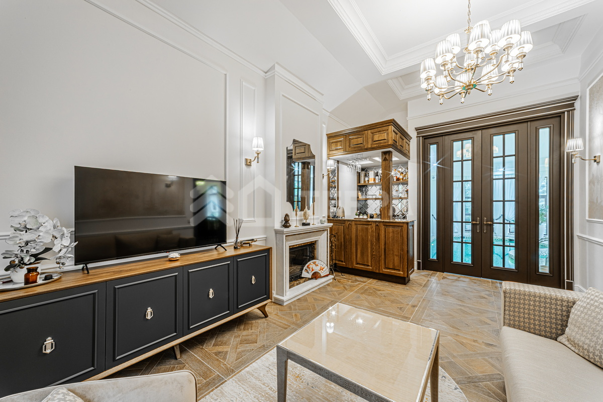 Главный дом (620 м?) с эффектной гостиной, камином и вторым светом, кухней с встроенной техникой и столовой с авторской мебелью. Пять спален, включая роскошную мастер-спальню с мебелью Fendi, шесть санузлов, просторная терраса, бильярдная, кабинет и полный комплект меблировки от премиальных брендов. Гараж на два автомобиля завершает это великолепие.
