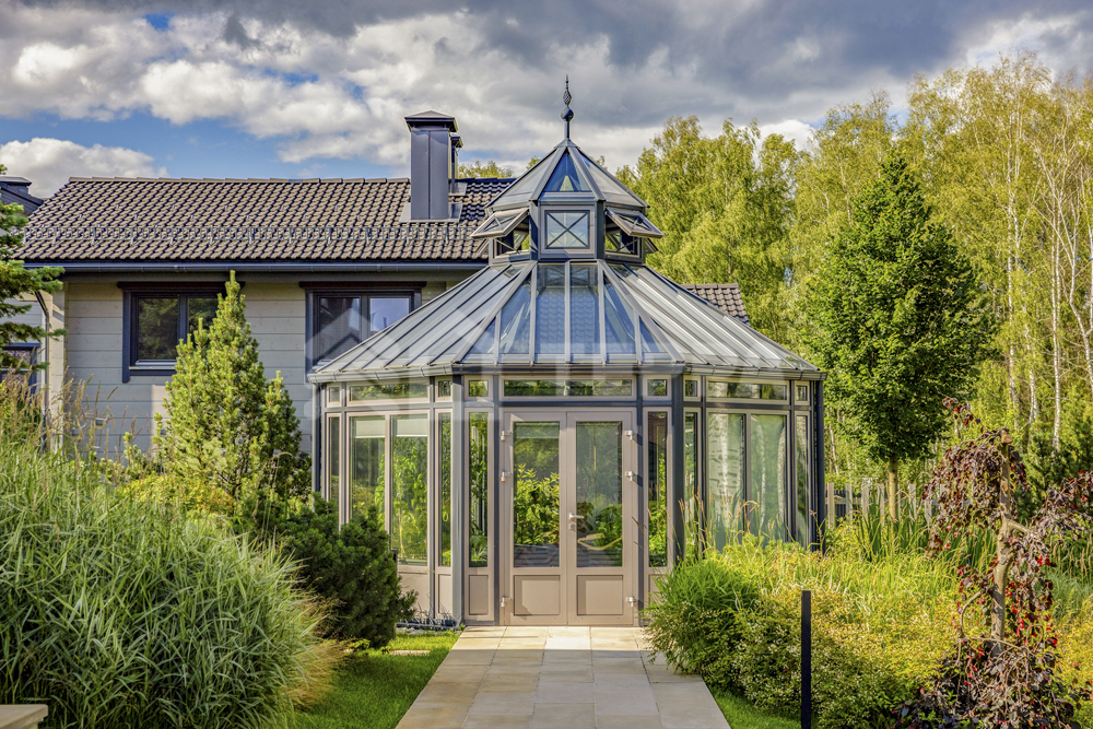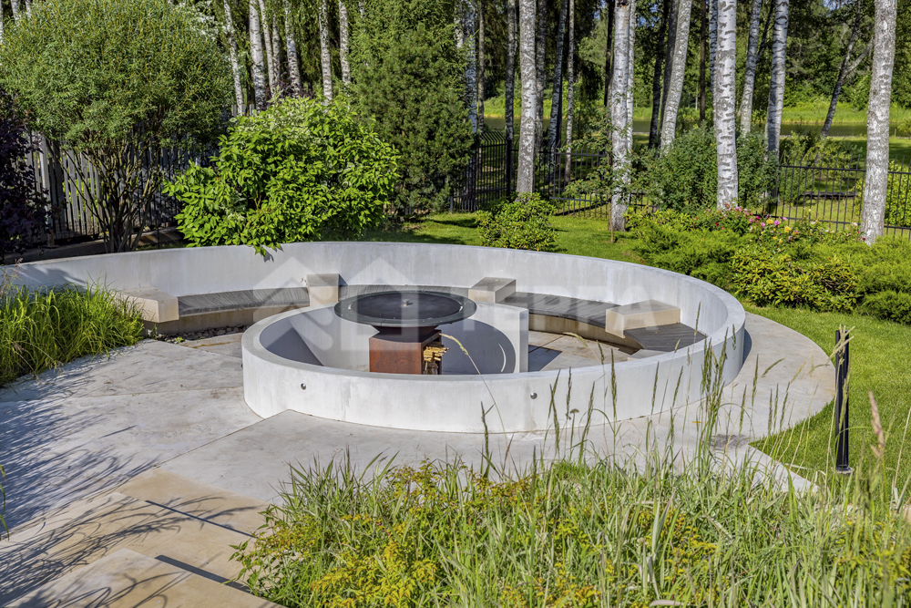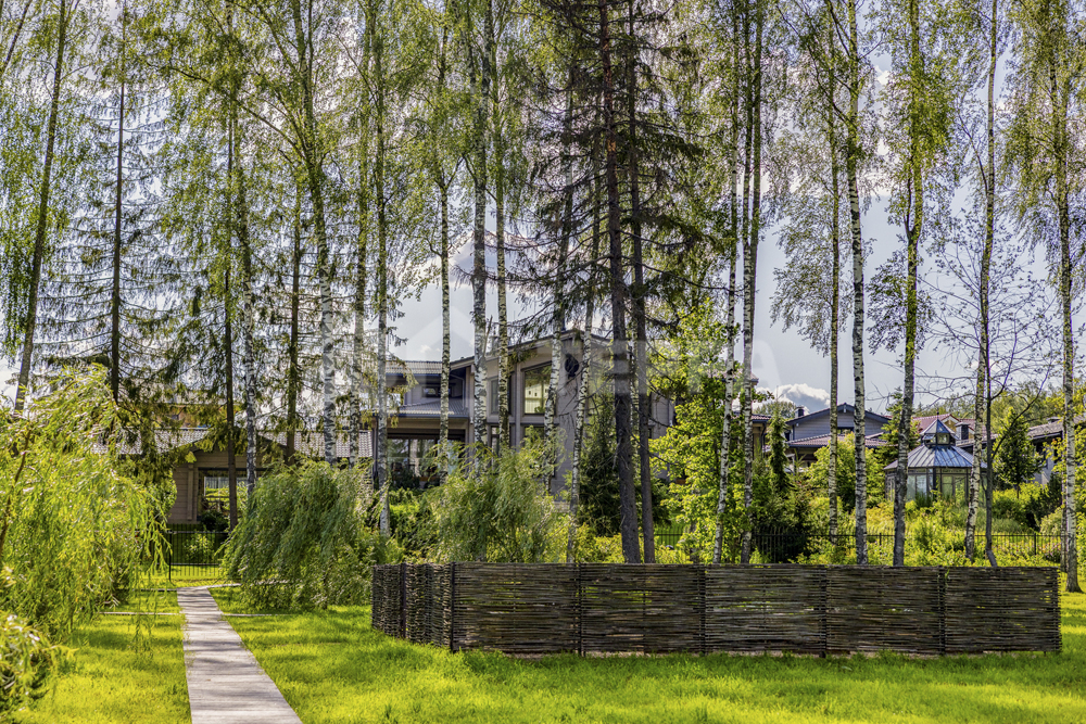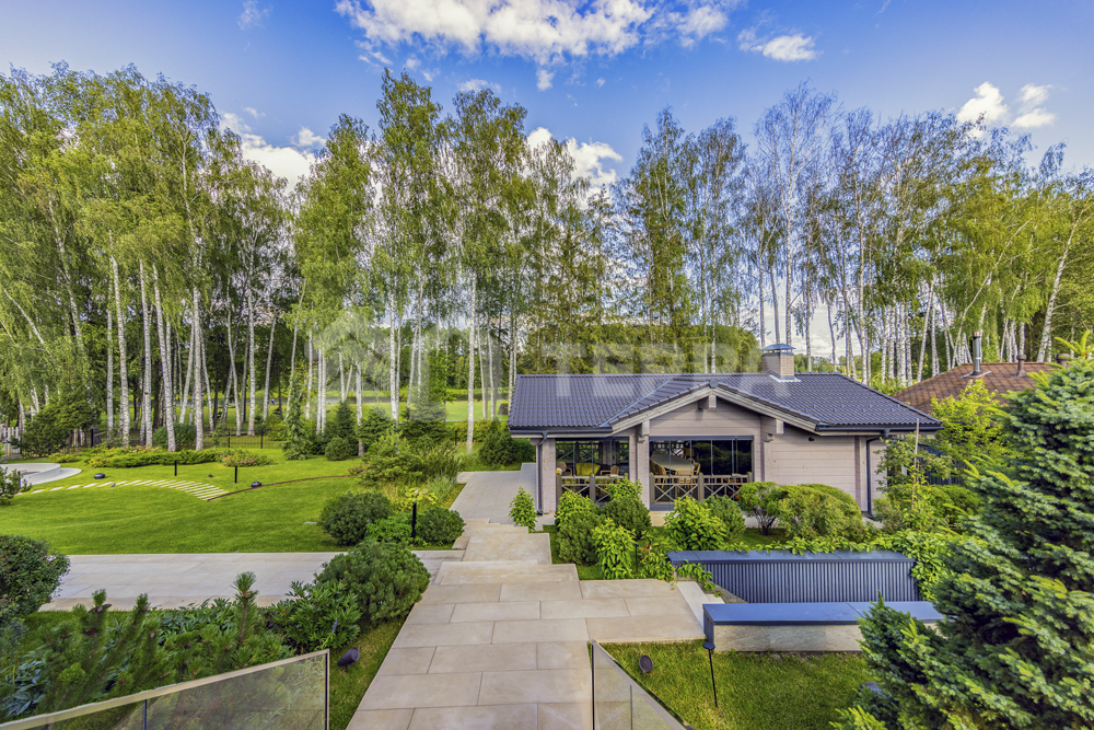 Территория дома утопает в зелени и плавных рельефах. Пространство тщательно организовано и продумано: стеклянный купол оранжереи, уютный павильон, аккуратная зона для огорода и оригинальное кострище в форме спирали создают гармонию с ухоженными газонами. Каменные дорожки изящно связывают различные локации, формируя единый ландшафт.