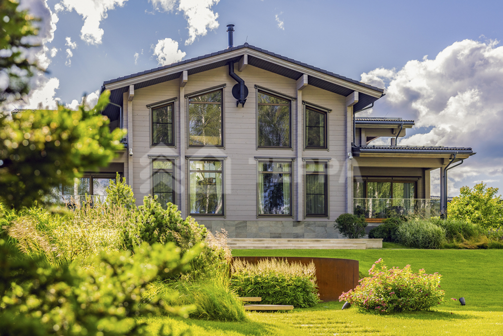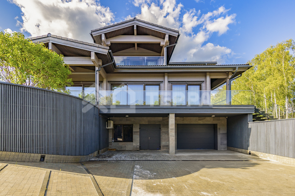 Коттедж площадью 730 кв.м. расположен на участке 25 соток, окруженный живописным лесом. Его фасад в современном стиле с элементами шале облицован камнем и деревом благородного серого оттенка. Крупные панорамные окна с тонкими переплетами подчеркивают симметрию строения, а массивные наклонные карнизы придают ему скандинавский характер. Каменное основание создает ощущение прочности, а утонченные вертикальные детали добавляют динамики.