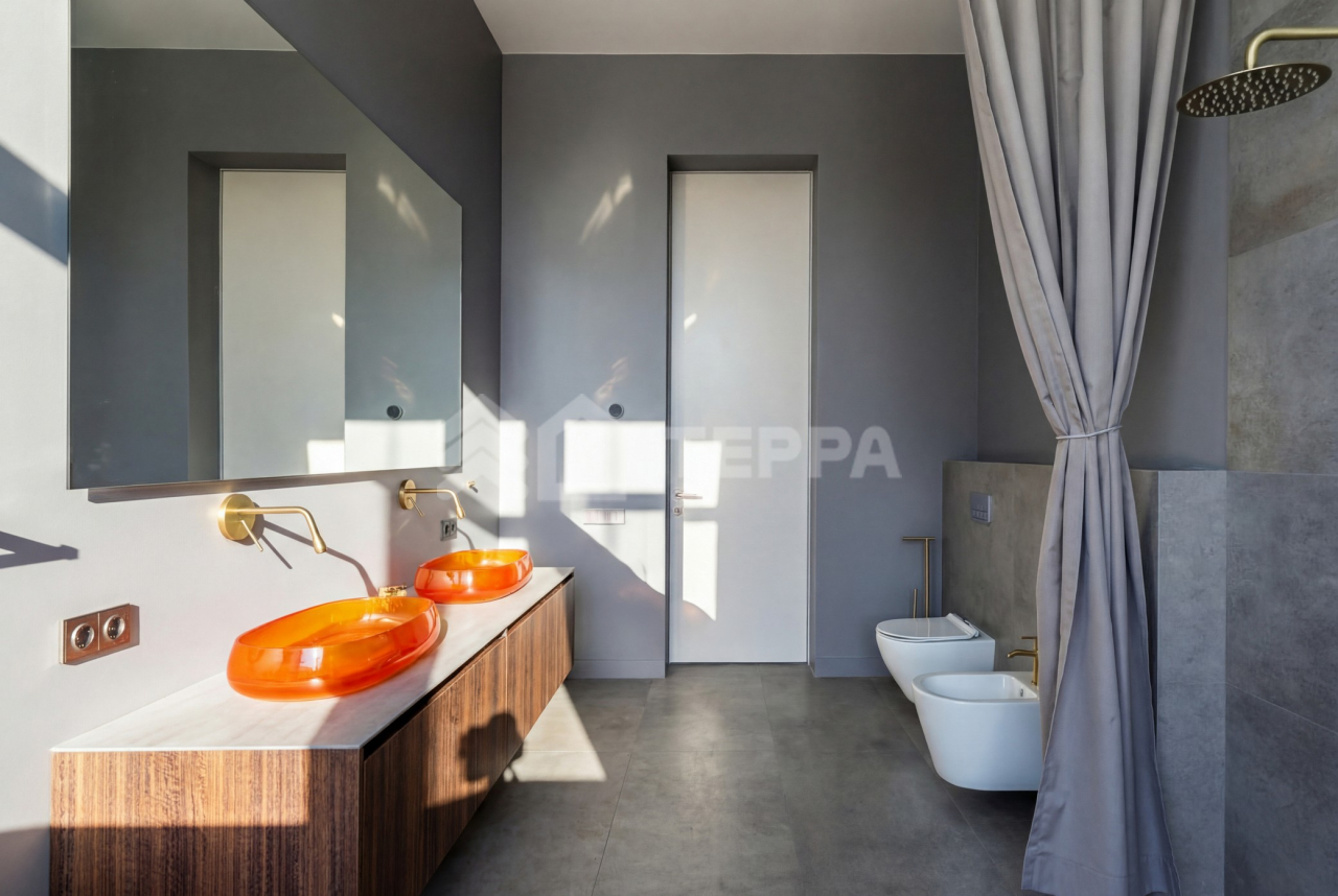 Авторский проект с панорамным остеклением и продуманным сценарием жизни. Все жилые зоны и мастер-спальни ориентированы на задний двор (Open Space), что гарантирует тишину и полную изоляцию от соседей. Высота потолков на первом этаже 3,7 м и 3,5 м на втором. Просторная терраса оборудована уличным камином и зоной барбекю — идеальное место для приемов в любое время года, так же предусмотрен удобный сервисный проход из гаража сразу на кухню через подсобное помещение (удобная разгрузка покупок).