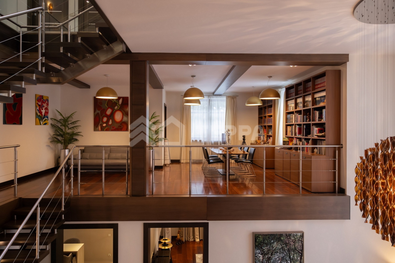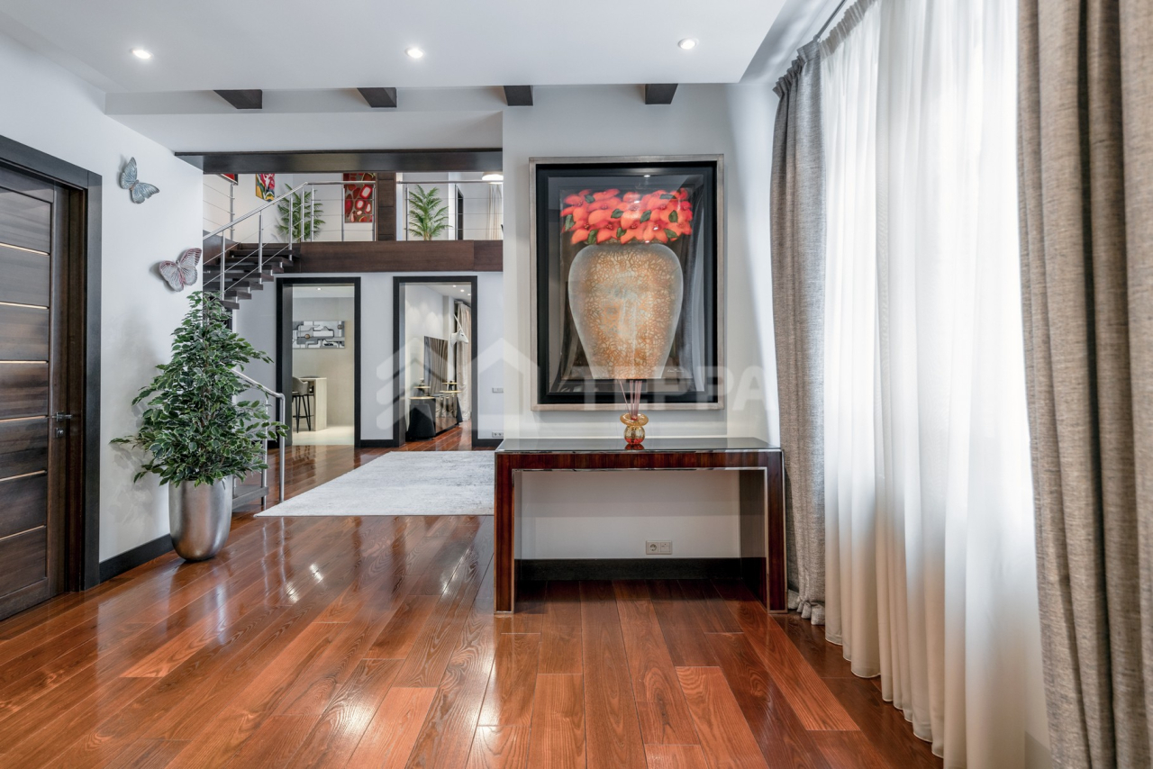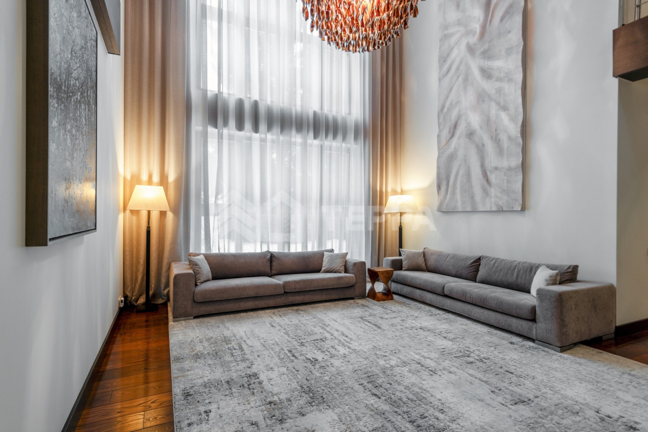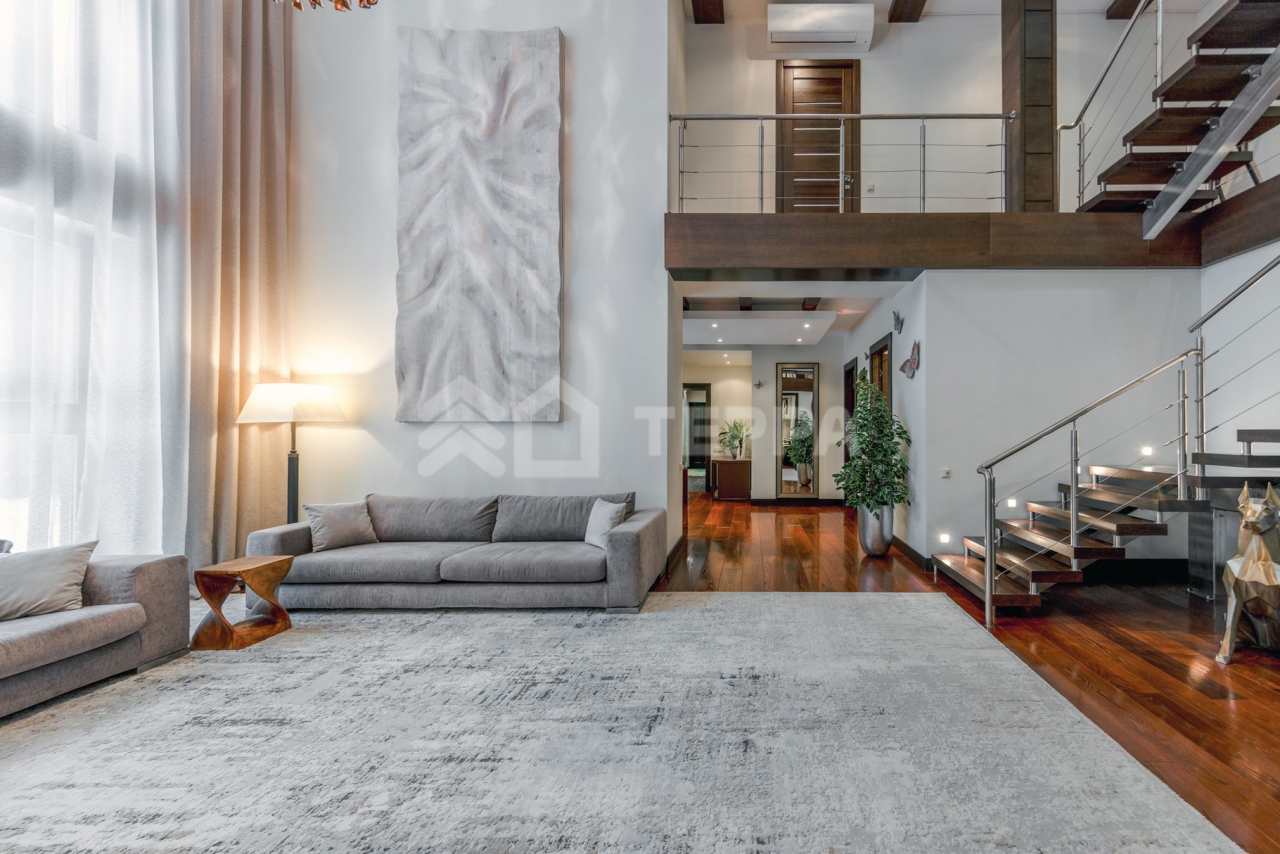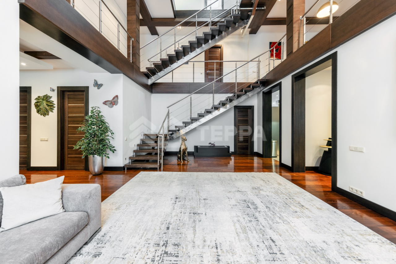 Дом общей площадью 650 кв. м расположен на участке 18 соток. Архитектурная идея построена на ощущении простора и естественного света: в доме реализован эффект второго света на всех уровнях, благодаря чему пространство выглядит особенно объемным и воздушным. Центральным акцентом интерьера стала эффектная «парящая» лестница - изящный архитектурный элемент, подчеркивающий современный характер резиденции. Сердцем дома является впечатляющая гостиная, вокруг которой выстроена вся внутренняя композиция пространства. Просторная, наполненная светом зона с высокими потолками и вторым светом создает атмосферу открытости и уюта одновременно. Планировочные решения продуманы до мелочей и создают баланс между общественными и приватными зонами. Особого внимания заслуживает мастер-зона: просторная мастер-спальня дополнена собственной гардеробной, ванной комнатой и будуаром. В доме также предусмотрена уютная библиотечная зона - идеальное пространство для чтения, работы и спокойного отдыха. На третьем этаже организована просторная детская территория - полноценное отдельное пространство для учебы, игр и отдыха. Гараж интегрирован в архитектурный контур здания, что обеспечивает максимальный комфорт в повседневной эксплуатации.