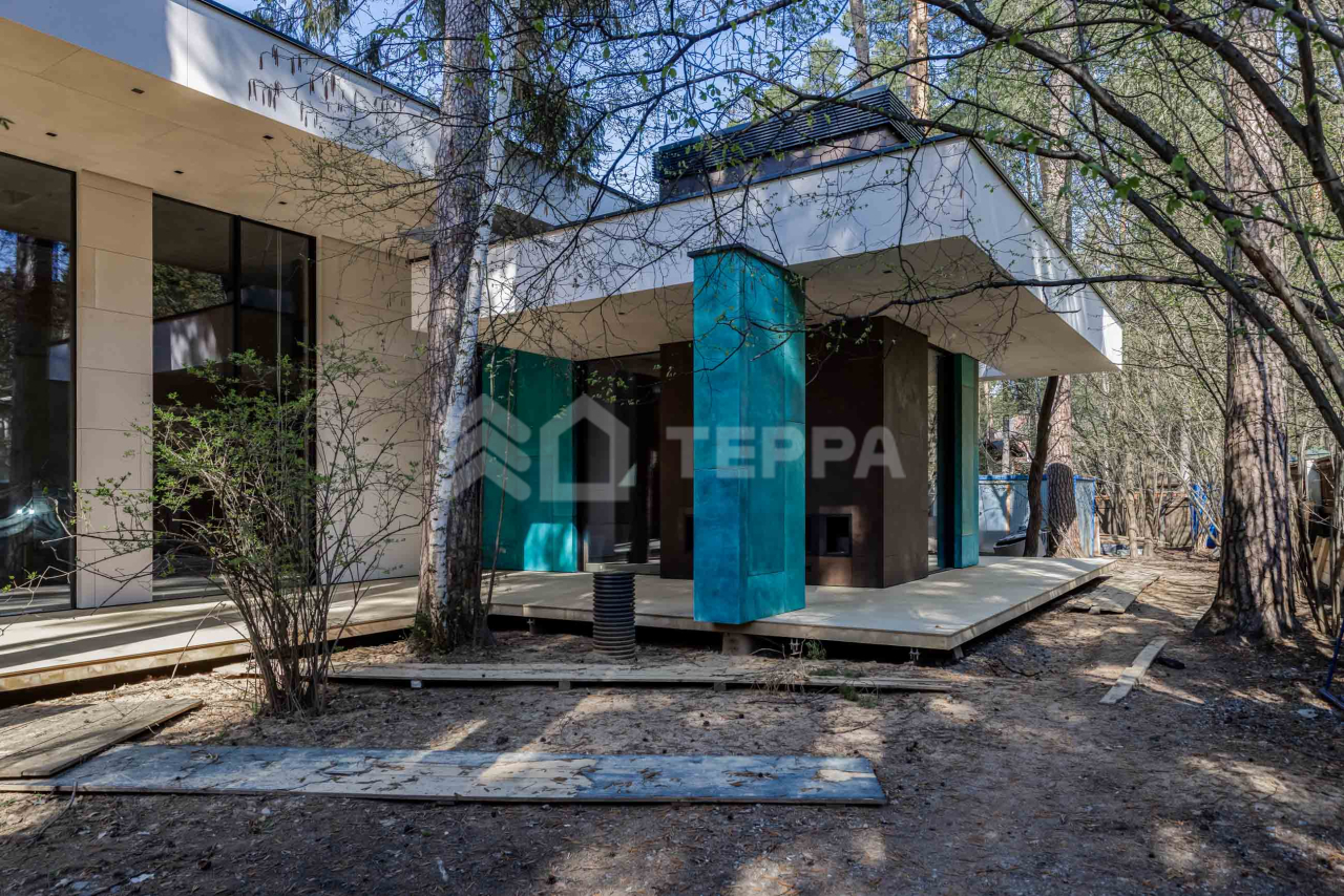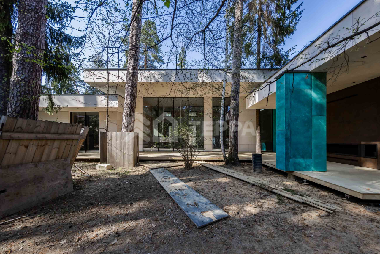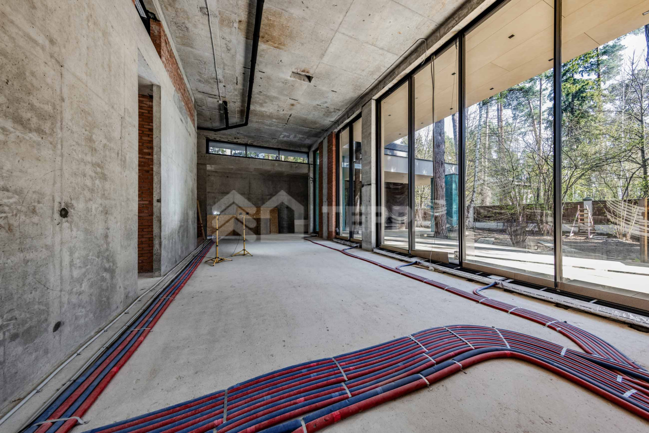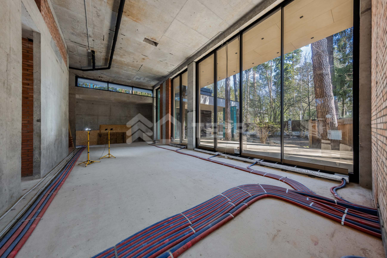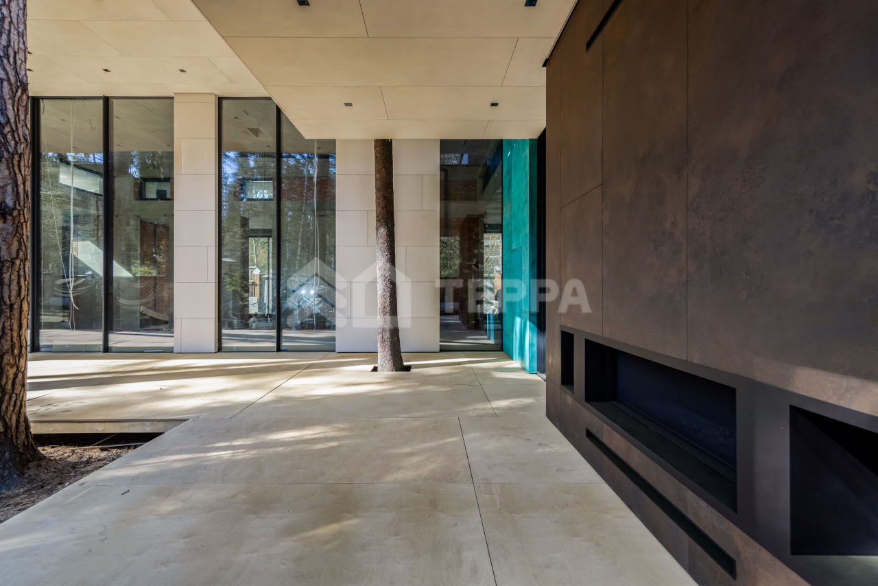 Планировка продумана до мелочей: просторный холл, несколько гардеробных и санузлов, каминный зал-столовая, основная и рабочие кухни с кладовыми, женский и мужской кабинеты (один из которых может служить спальней), отдельная зона для персонала с собственным входом, постирочная, бельевая, серверная, гараж на 3 машины и мастерская (имеет рядом с/у и можно сделать блок спальни). В жилой части — мастер-блок с будуаром, гардеробной, ванной и спальней, а также 2 детских блока. Проект по вентиляции предусматривает увлажнение, по электрике выполнялся с учётом возможности установить «умный дом». Высота потолков — впечатляющие 6 метров, это придаёт пространству объём и лёгкость. Имеется готовый дизайн-проект интерьеров от студии SL, выдержанный в лаконичном и современном стиле. Фасад дома выполнен из португальского известняка, натурального гранита, премиального керамогранита и патинированной меди, что создаёт эффектную и благородную архитектурную палитру. Выполнено фасадное освещение на европейском оборудовании премиального уровня. Установлены эксклюзивные окна Skyframe и профили Schuco, обеспечивающие максимум света, тепла и шумоизоляции. Дом уже введён в кадастр, функционирует отдельная котельная с двумя котлами Viessmann, а также своя скважина. Подведено 150 кВт электроэнергии, выполнен проект по вентиляции, слаботочным системам и освещению, установлены зенитные фонари.