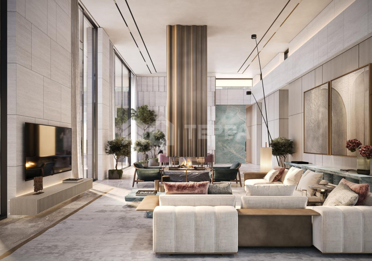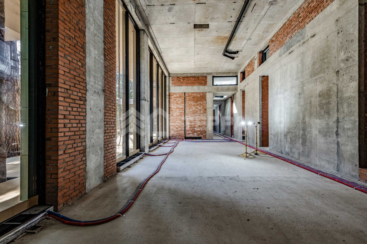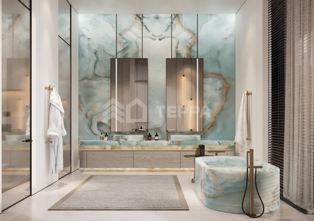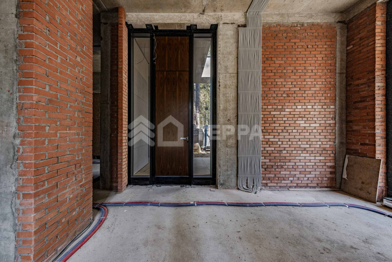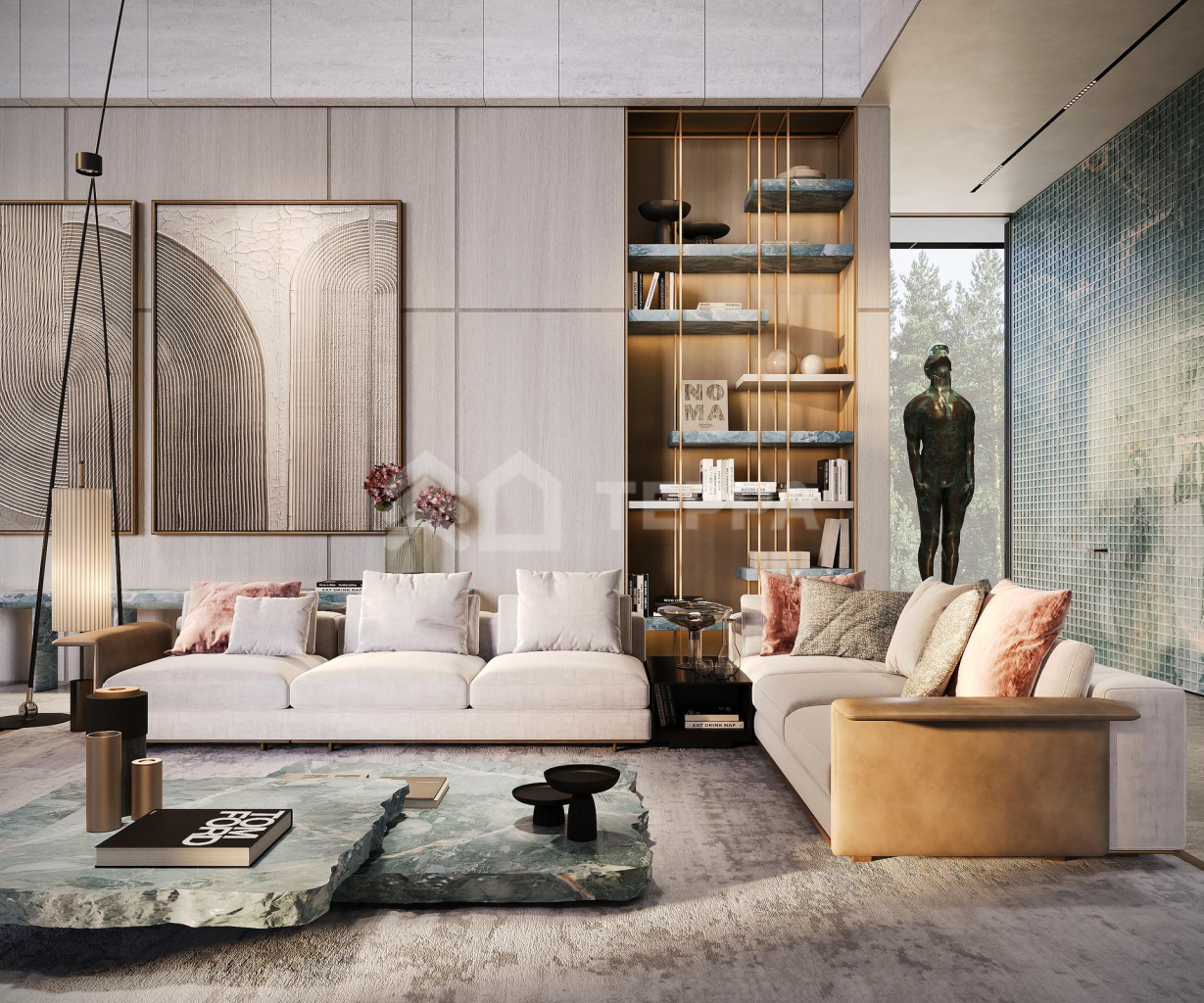 Планировка продумана до мелочей: просторный холл, несколько гардеробных и санузлов, каминный зал-столовая, основная и рабочие кухни с кладовыми, женский и мужской кабинеты (один из которых может служить спальней), отдельная зона для персонала с собственным входом, постирочная, бельевая, серверная, гараж на 3 машины и мастерская (имеет рядом с/у и можно сделать блок спальни). В жилой части — мастер-блок с будуаром, гардеробной, ванной и спальней, а также 2 детских блока. Проект по вентиляции предусматривает увлажнение, по электрике выполнялся с учётом возможности установить «умный дом». Высота потолков — впечатляющие 6 метров, это придаёт пространству объём и лёгкость. Имеется готовый дизайн-проект интерьеров от студии SL, выдержанный в лаконичном и современном стиле. Фасад дома выполнен из португальского известняка, натурального гранита, премиального керамогранита и патинированной меди, что создаёт эффектную и благородную архитектурную палитру. Выполнено фасадное освещение на европейском оборудовании премиального уровня. Установлены эксклюзивные окна Skyframe и профили Schuco, обеспечивающие максимум света, тепла и шумоизоляции. Дом уже введён в кадастр, функционирует отдельная котельная с двумя котлами Viessmann, а также своя скважина. Подведено 150 кВт электроэнергии, выполнен проект по вентиляции, слаботочным системам и освещению, установлены зенитные фонари.