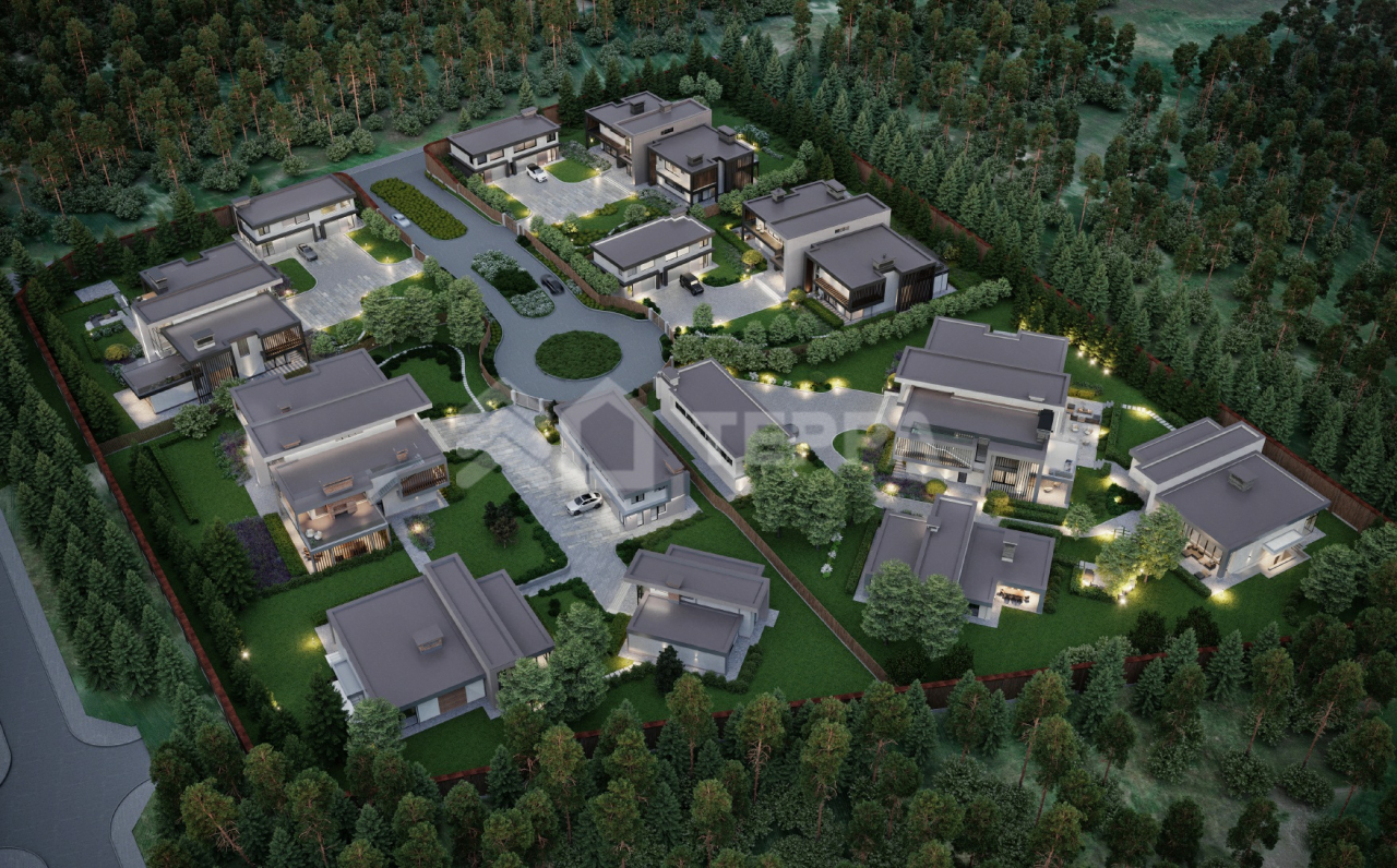 Клубный поселок рассчитан на 5 вилл с собственными СПА-комплексами (в зависмости от проекта), гостевыми домами и отдельно стоящими гаражами, в которых расположились аппартаменты для персонала.
