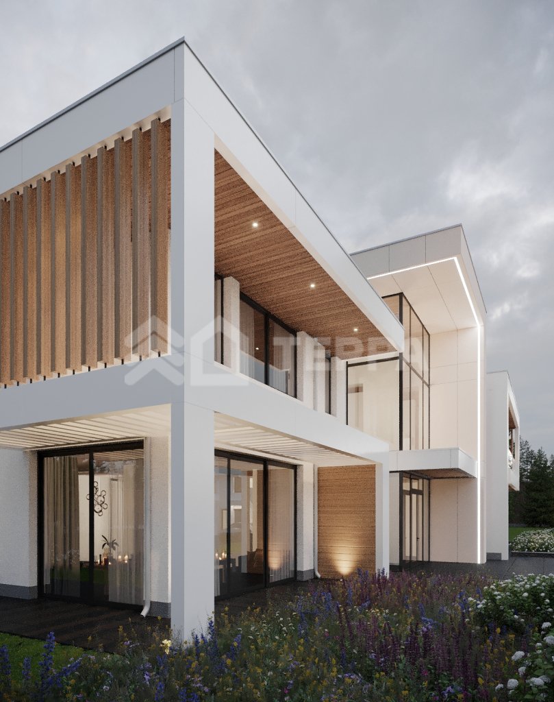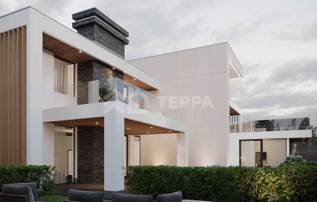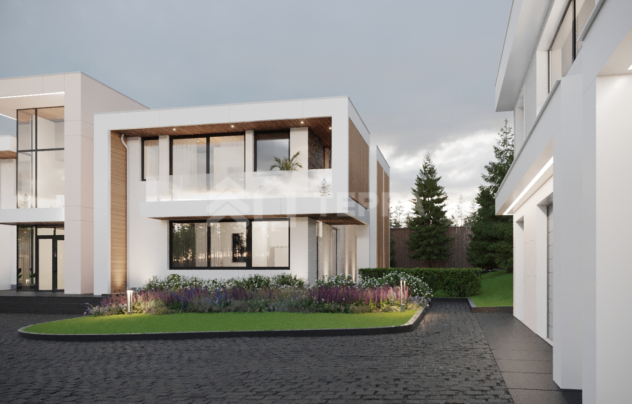Абсолютно новый современный дом 1037 м2 под отделку расположен на приватном участке 27 соток.