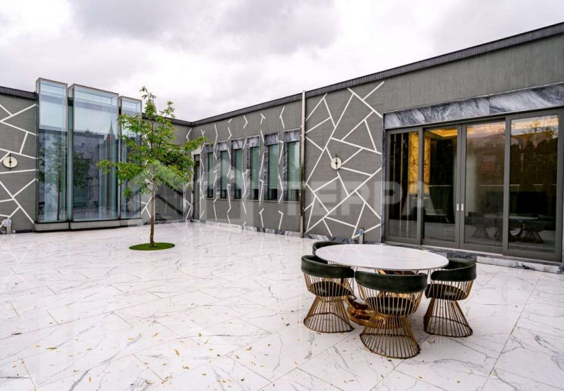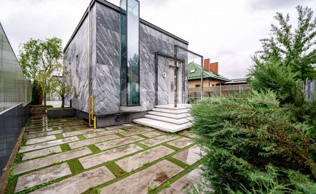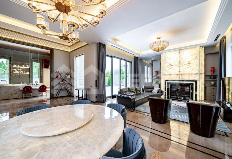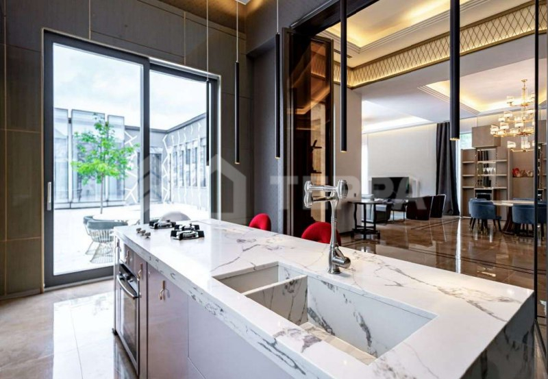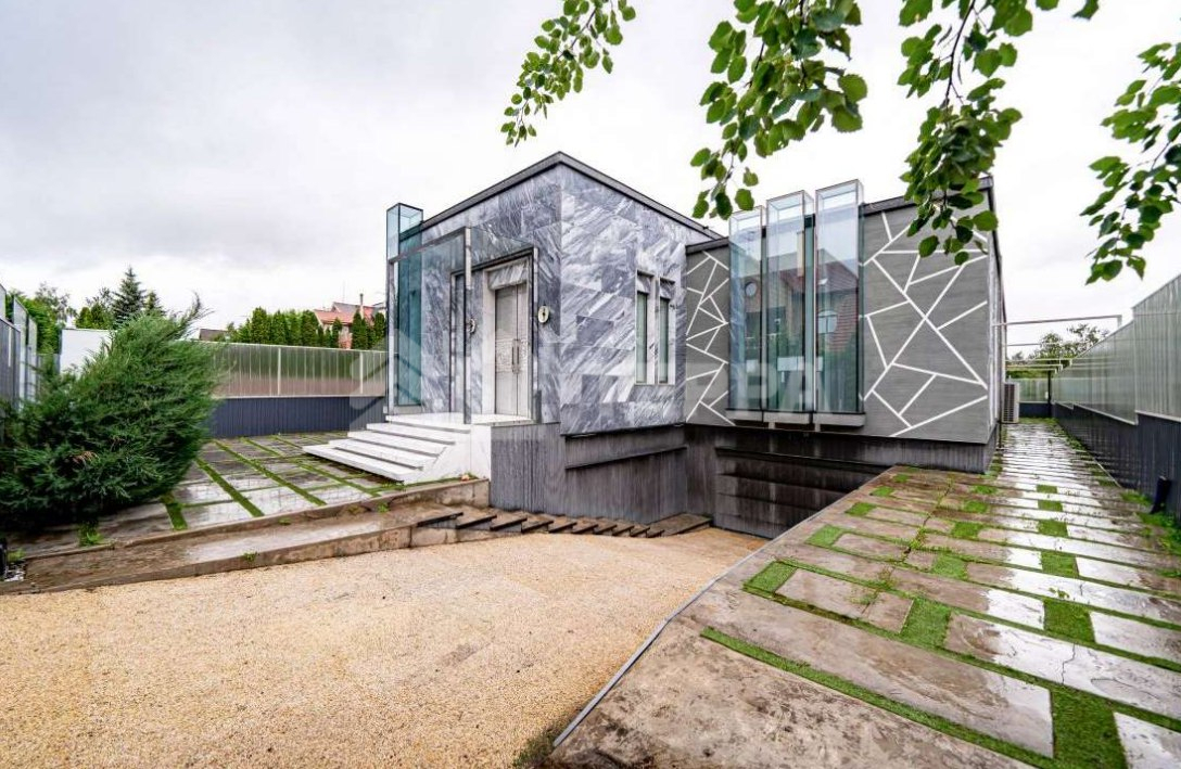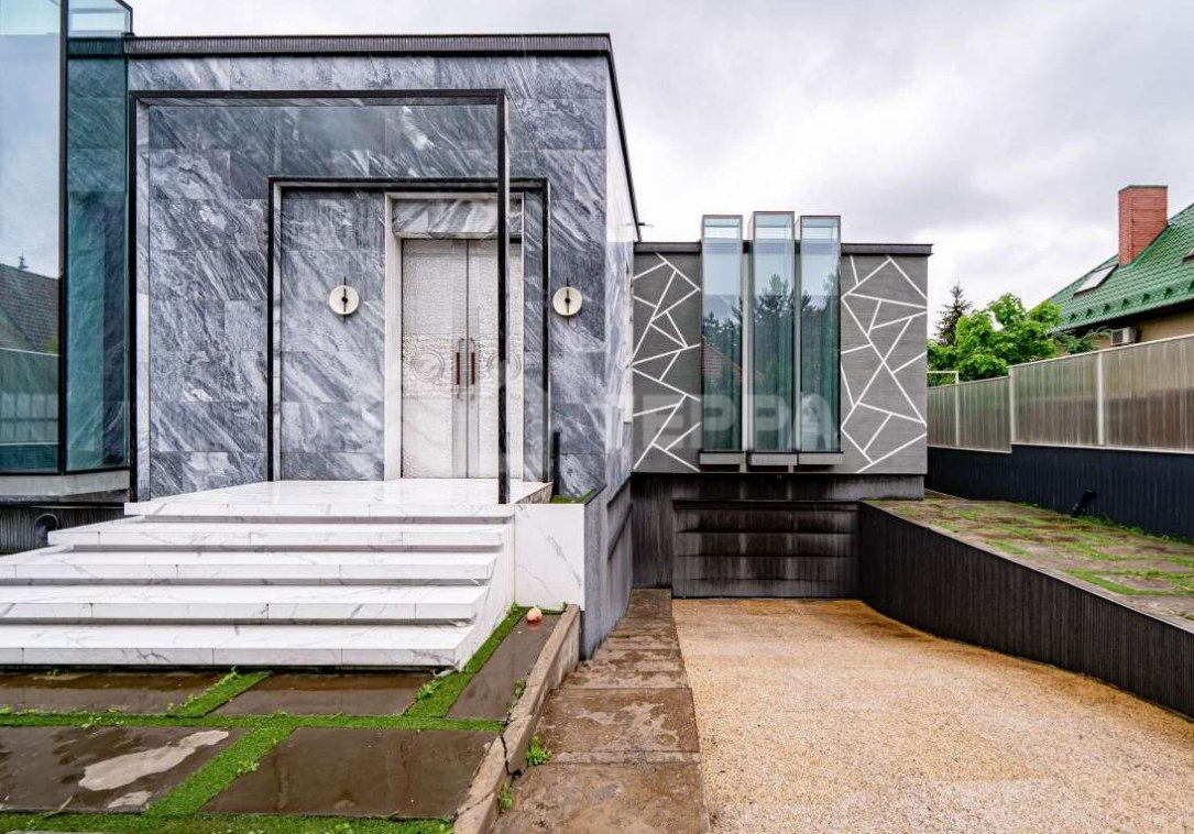 Среди особенностей дома: уютная гостиная с камином из оникса с подсветкой, современная кухня с выходом на террасу, 3 спальни и кабинет, 3 санузла, а также постирочная и гардеробная. Фасад из серого мрамора придаёт зданию особую элегантность.