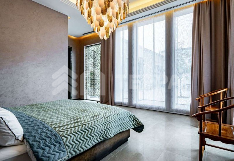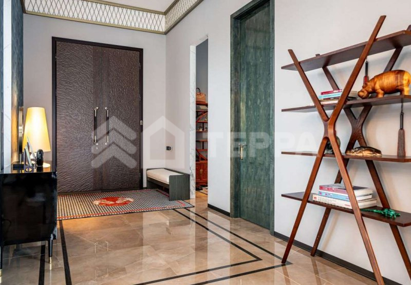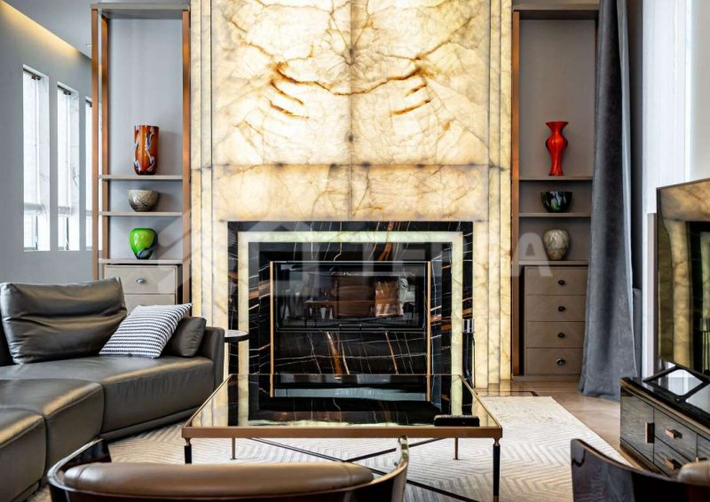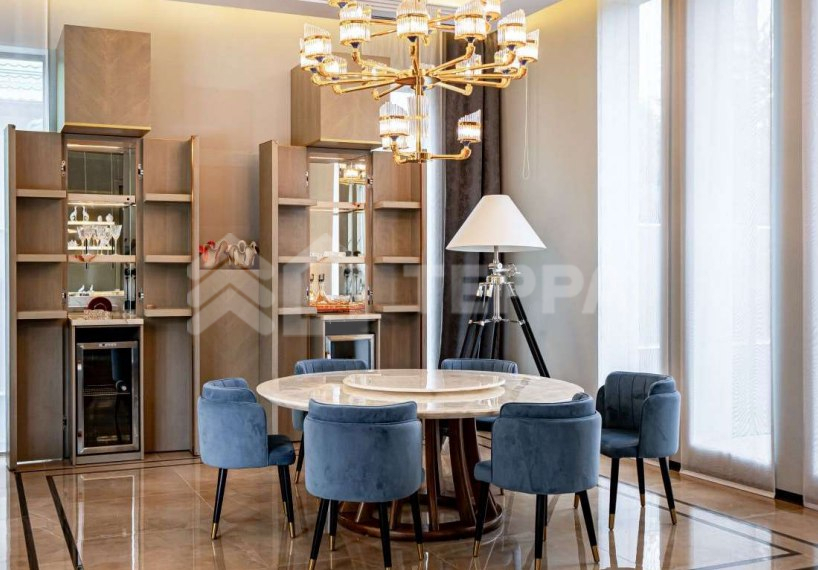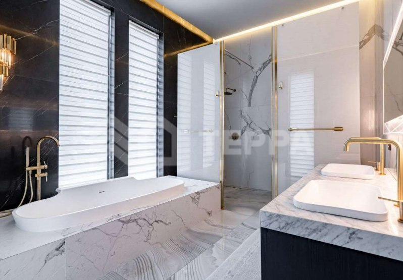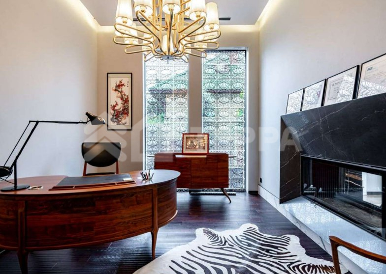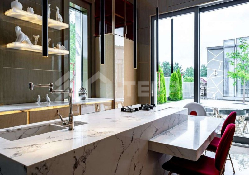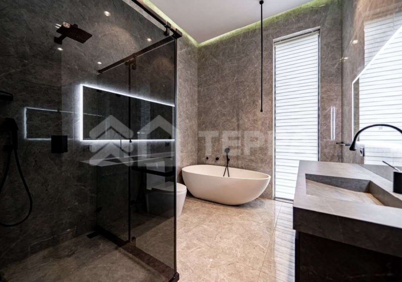 Среди особенностей дома: уютная гостиная с камином из оникса с подсветкой, современная кухня с выходом на террасу, 3 спальни и кабинет, 3 санузла, а также постирочная и гардеробная. Фасад из серого мрамора придаёт зданию особую элегантность.