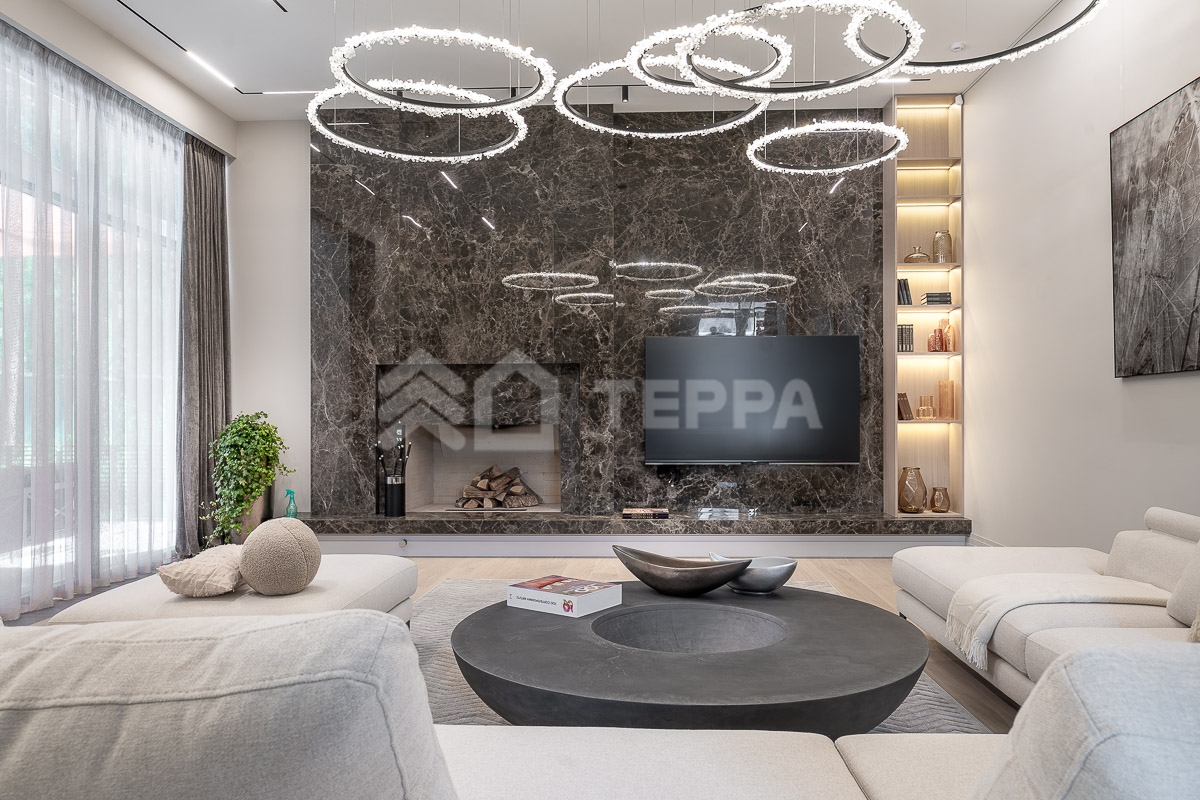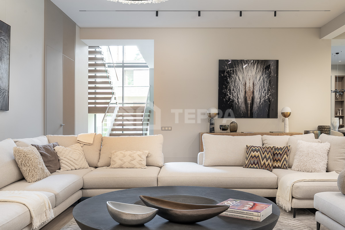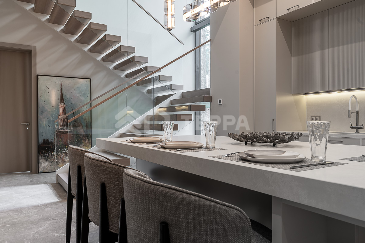 Органическая архитектура дома позволяет наслаждаться stunning видами на вековой лес через панорамные окна. На первом этаже вас ждут уютная гостиная с дровяным камином, столовая с баром и выходом на террасу, функциональная кухня с островом, а также гостевая спальня и постирочная.