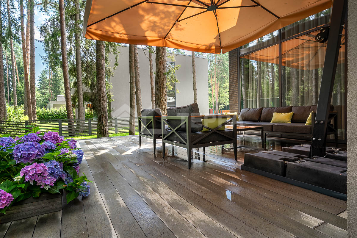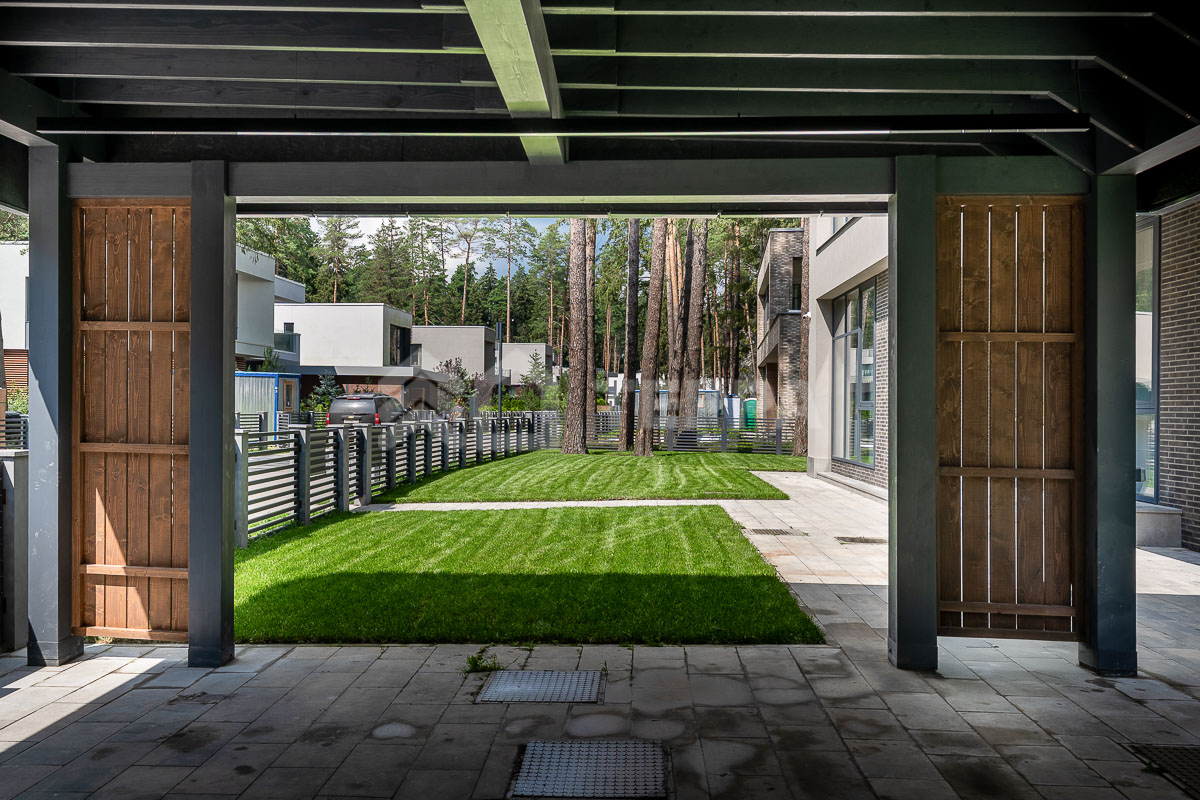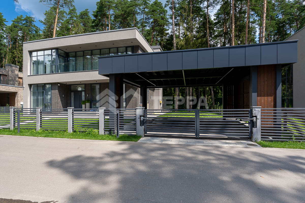 На участке с завершенным ландшафтным дизайном укрыт естественный лесной ландшафт. Есть навес для двух автомобилей.