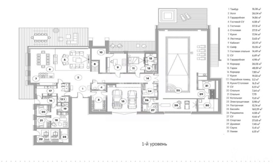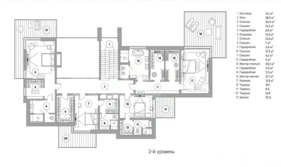- 5 спален с гардеробными, 4 из которых имеют выход на террасы