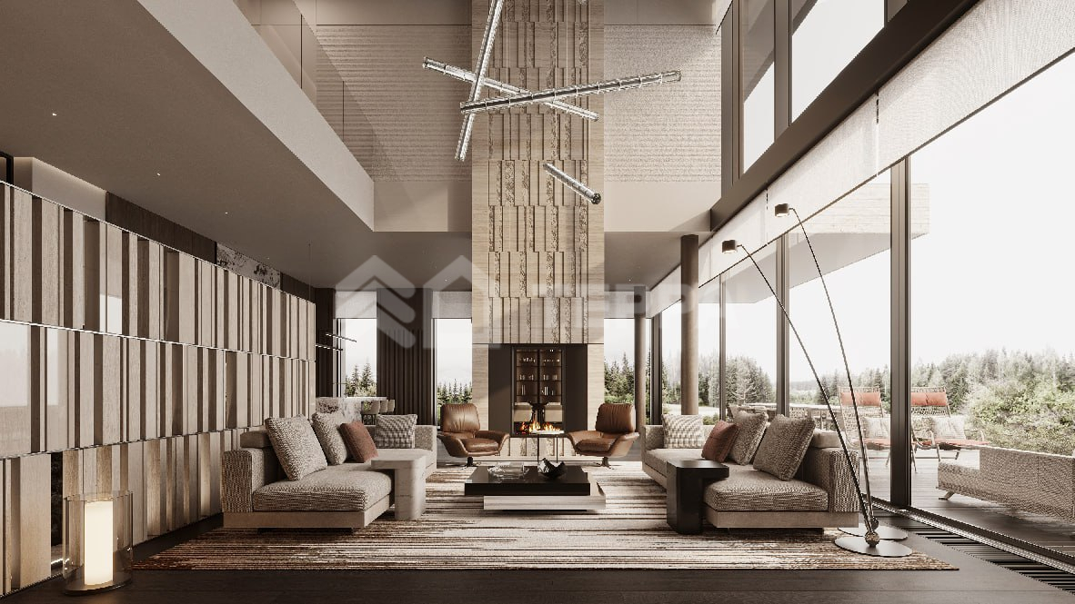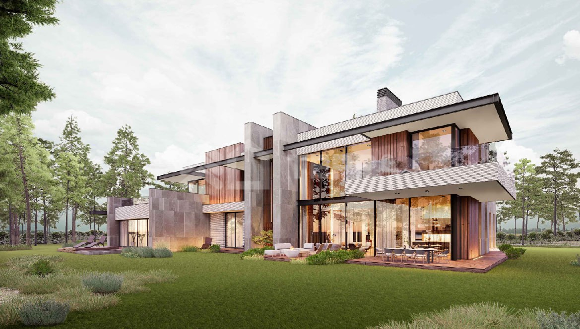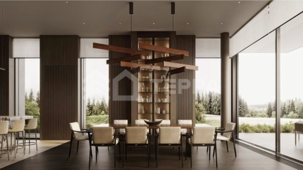 Погрузитесь в мир комфорта в загородной резиденции площадью 1181 кв.м. на участке 35 соток. Этот современный дом с фасадом в сдержанных серых тонах, облицованным доломитом и керамогранитом, порадует вас панорамными окнами.