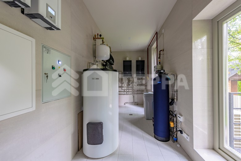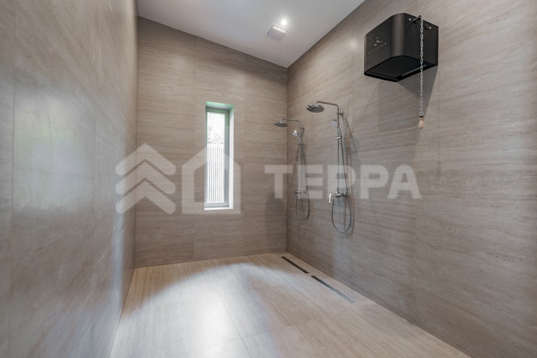 Технологичность не уступает эстетике: приточно-вытяжная вентиляция, кондиционирование, повышенное давление воды, водоочистка, электроприводы штор, датчики протечек, видеонаблюдение, закладные под бассейн на участке, мощность 25 кВт электричества.