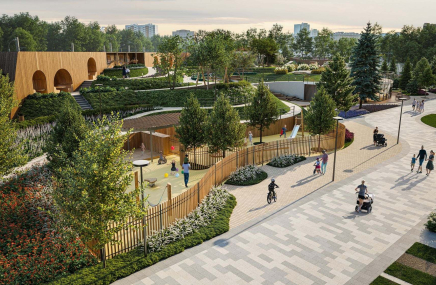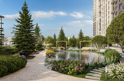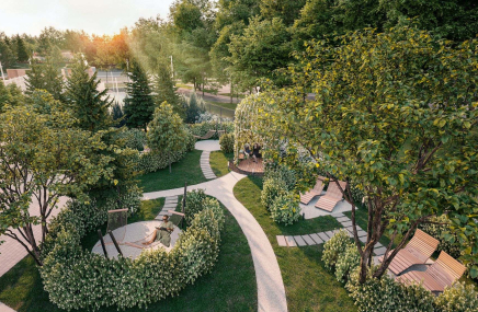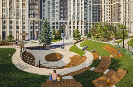 На территории проекта создан ландшафтный двор, площадью 1,7 га. Благодаря оригинальному рельефному решению двор превратился в тихий зеленый оазис, скрытый от шума улиц. Центр притяжения жителей — общественная гостиная с террасой под открытым небом, аналогов которой нет ни в одном дворе Москвы. Пока дети осваивают развивающую игровую площадку, взрослые могут отдохнуть и пообщаться с соседями в гостиной.