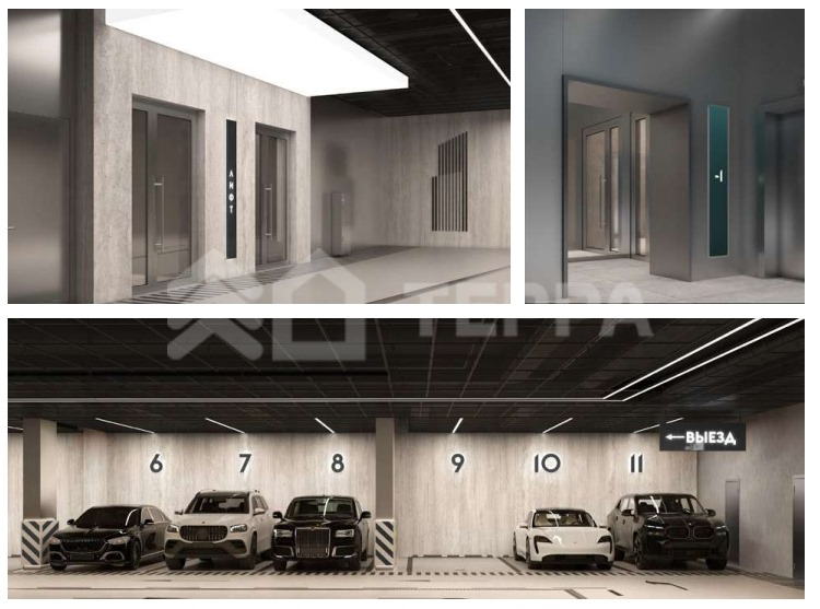 В подземной части «Дом Дау» на металлические стены нанесены изображения физических формул Льва Ландау, что создает тизер для жителей и гостей проекта, знакомя их с историей человека, вдохновившего на название небоскреба. Выбранные материалы — травертин и мрамор — отличаются легкостью в уходе и долговечностью.