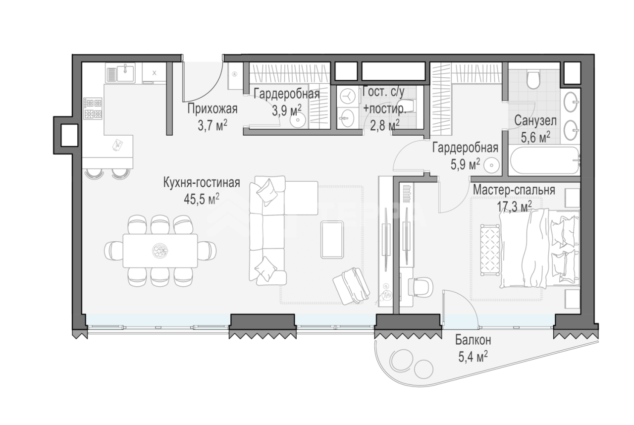 Светлая квартира площадью 86 кв. м с окнами на южной стороне. Продуманная планировка позволяет разместить одну или две отдельные спальные комнаты.