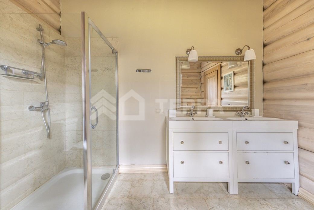 Характеристики дома: фундамент – ленточный, стены - дерево (Карельская сосна 25 см), окна – деревянные, перекрытия – деревянные, материал крыши - мягкая кровля, оснощение дома- газовый котел. Конвекторы электрические MINiB, теплые полы во всех ванных комнатах и санузлах, система фильтрации воды, газовая и пожарная сигнализация, охранная сигнализация Гольфстрим.