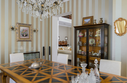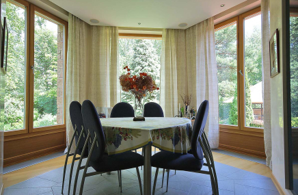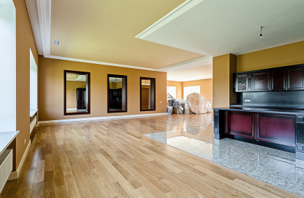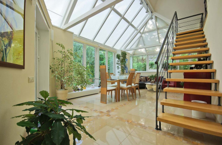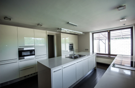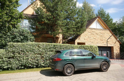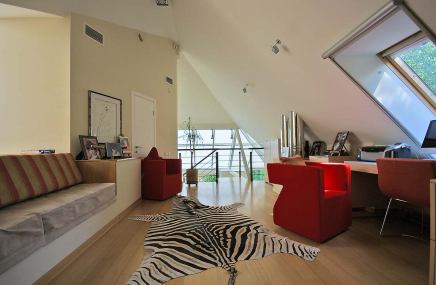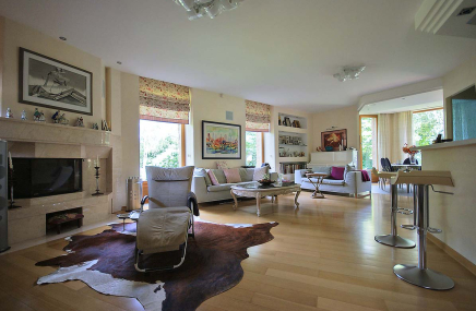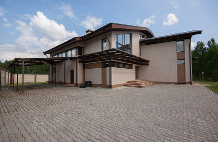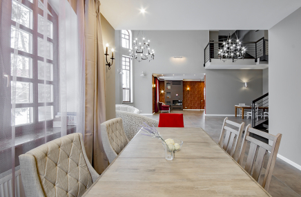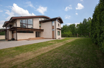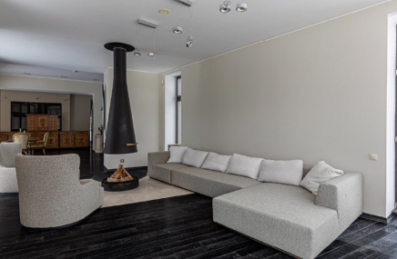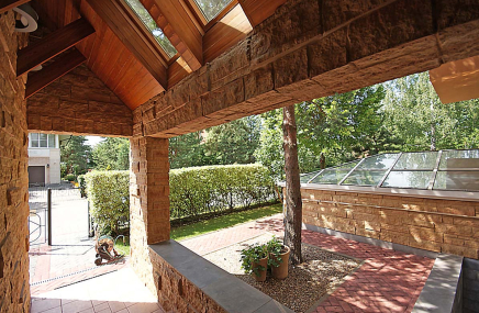 1-й этаж отведен под объединенное пространство двусветной гостиной и столовой с выходом на участок и к беседке-барбекю. А кухню от гостиной отделяет раздвижная перегородка из тонированного стекла. Также на 1-м этаже есть большой спальный блок – гостинаядетская игровая, спальня с су и гардеробной. Также здесь расположены сезонная гардеробная, гостевой су и гараж на 2 мм, отделанный также качественно, как и весь дом.