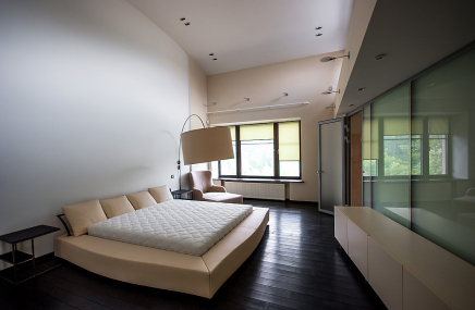 Хозяйская спальня на втором этаже отделена от гостиной звукоизолирующей стеклянной стеной. Это пространственное решение визуально увеличило объём комнаты. Наполнение спальни: кровать, панели - ANTON PETROV Unique Home. Кресла, покрывало - MHC (Milano Home Concept). Текстильное оформление кровати - Ateliertati. В мастер-ванной — мрамор Giallo Siena, смесители, Fantini, раковины, Artceram, сложная конструкция зеркал с покрытием нитридом титана, уникальные металлические ручки.