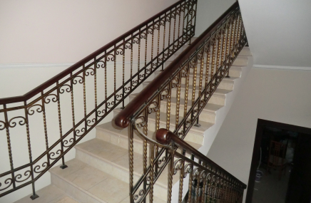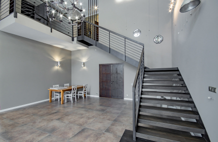 Лестница выглядит эффектной за счёт отделки чёрным дубом и использования подсветки ступеней. Она выполнена в виде абстрактного орнамента, напоминающего стилизованные ветки дерева. Стена здесь оформлена декоративной штукатуркой, повторяющей структуру натурального камня с золотыми прожилками.