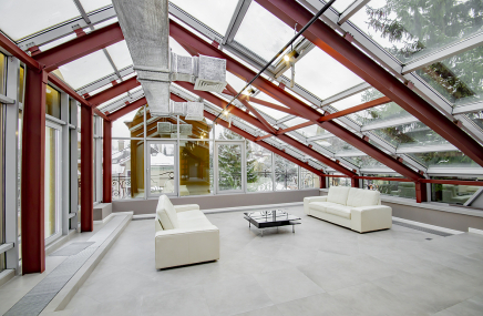 В доме устроена приточно-вытяжная вентиляция с кондиционированием и увлажнением.