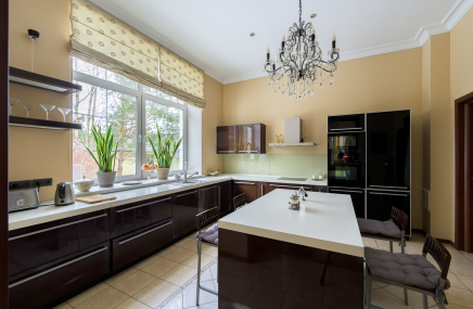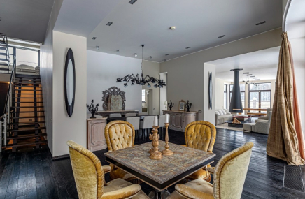 В отделке кухонной мебели использованы чёрная эмаль с глянцевым лаком, вставки из жидкой латуни, декоративное покрытие фасадов «лава», гранит Brown Antique. Кухня, ANTON PETROV Unique Home. Обеденный стол выполнен на заказ. Стулья, Deep House. Подсвечники, Repeat Story.