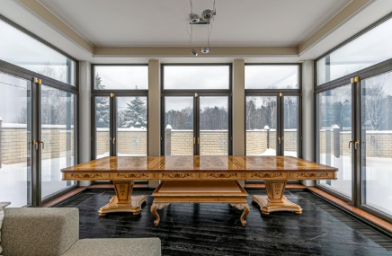 Весь дом наполнен красивыми вещами, неординарными материалами, приятными и интересными фактурами. Металл, в том числе латунь, натуральный камень, американский орех, палисандр, бархат и алькантара, редкие техники обработки материалов – такой богатый микс нивелирован сдержанной палитрой. Её высоту подчеркнули оформленная деревянными панелями стена и камин с отделкой из керамогранита и зеркал. В этом проекте вся корпусная мебель, включая кухню, была разработана по индивидуальным эскизам и изготовлена на собственном производстве архитектора.