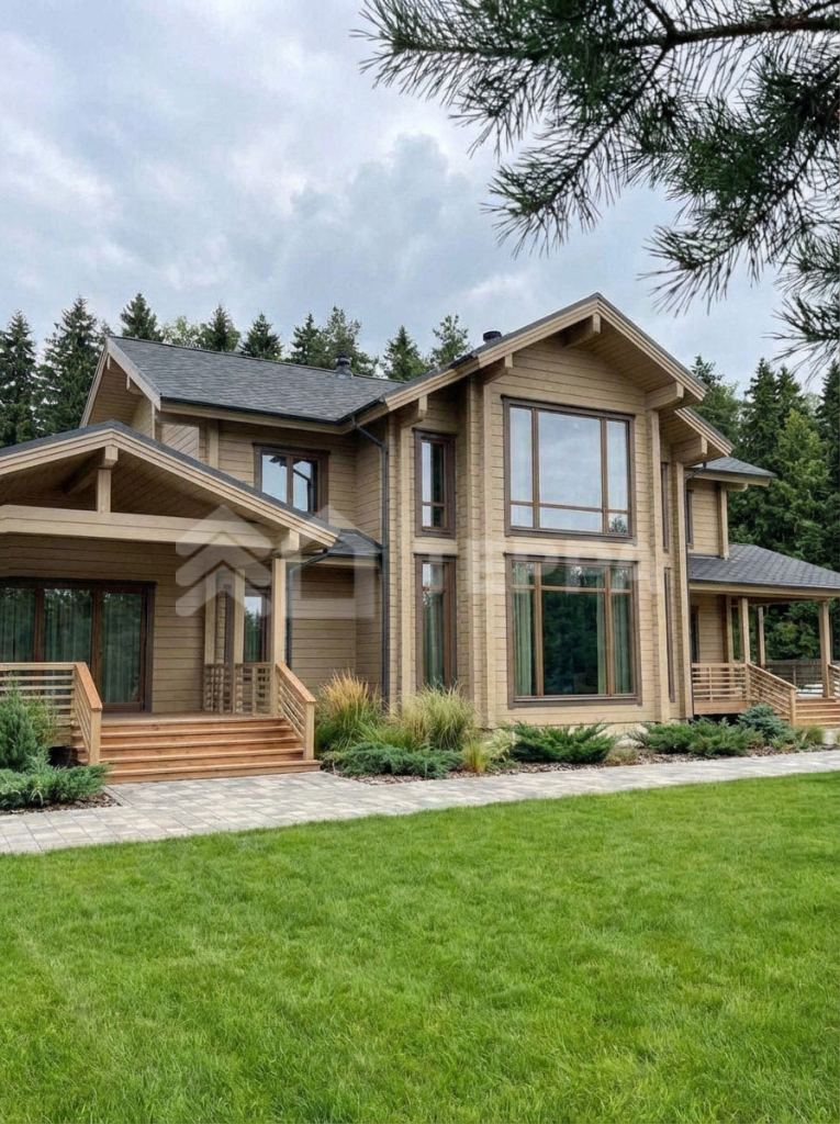 Дом из клееного бруса 500 м2, гараж 107 м2 (газифицированная котельная, квартира для помощников). Участок на первой линии гольфа 25,8 соток с ровным ландшафтом, видом на гольф поле (ИЖС).