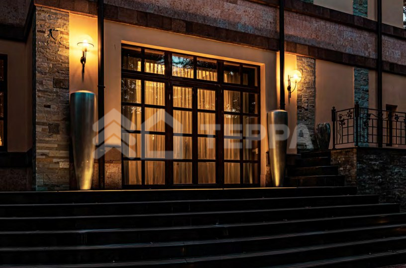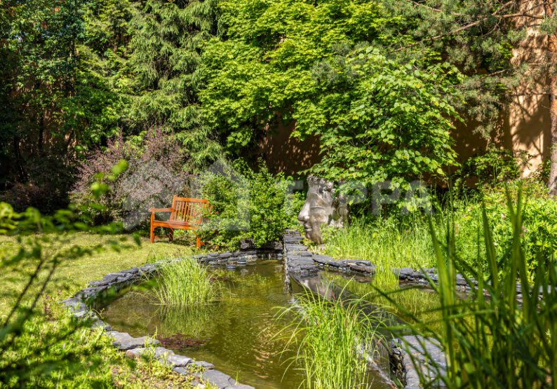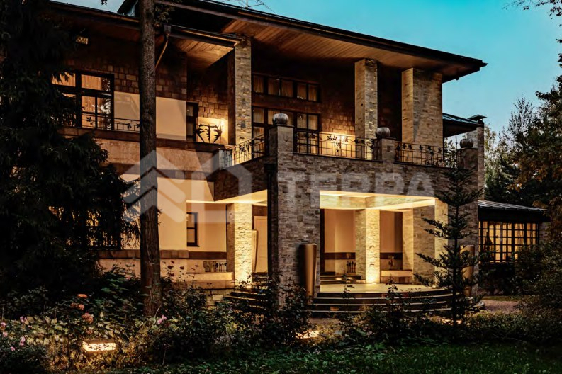 Дом 847 м2 в стиле органической архитектуры Ллойда Райта. Приватный лесной участок 56 соток с ландшафтным дизайном, каскад прудов с рыбками, ручей, прогулочные дорожки и уличное освещение. Основной дом удалён от других построек, обеспечивая уединение и спокойствие.