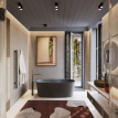 Планировкой предусмотрены: тамбур, просторная прихожая с гардеробом, что необходимо для загородного жилья и нашего климата; залитая лучами солнца через панорамные окна зона гостиной; эргономичная зона столовой с отдельным входом для вашего удобства; двусторонний камин для длинных зимних вечеров и бокала любимого вина; 5 больших шумоизолированные друг от друга спальни, каждая из которых располагает своим гардеробом и ванной комнатой; отдельная зона технического помещения для хранения, стирки и глажки. Выход из гостиной зоны на открытую террасу, которая прекрасна в любой сезон.