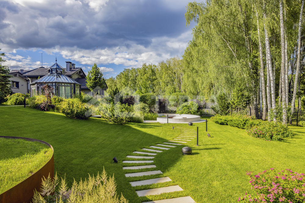 Территория дома утопает в зелени и плавных рельефах. Пространство тщательно организовано и продумано: стеклянный купол оранжереи, уютный павильон, аккуратная зона для огорода и оригинальное кострище в форме спирали создают гармонию с ухоженными газонами. Каменные дорожки изящно связывают различные локации, формируя единый ландшафт.