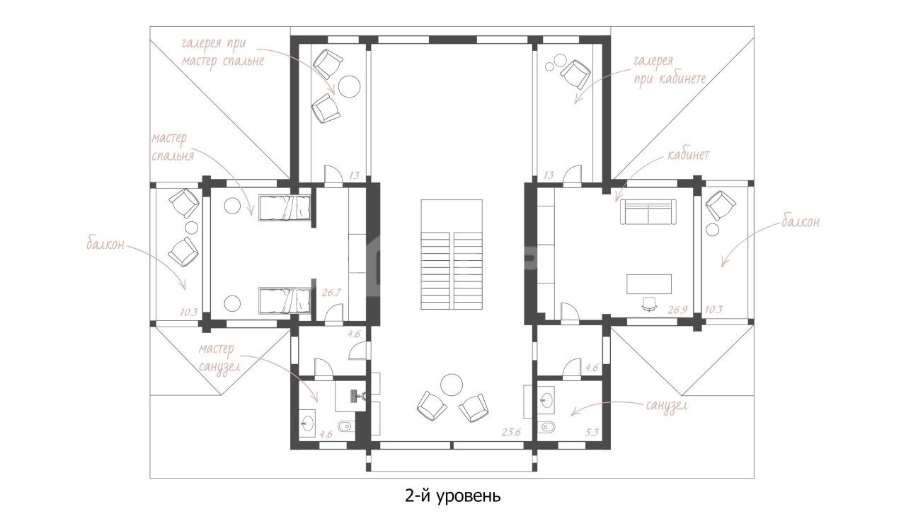 - спальня с галереей санузлом и балконом